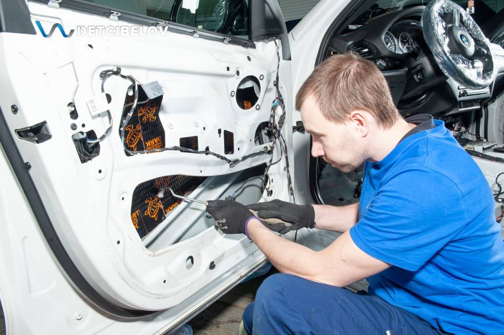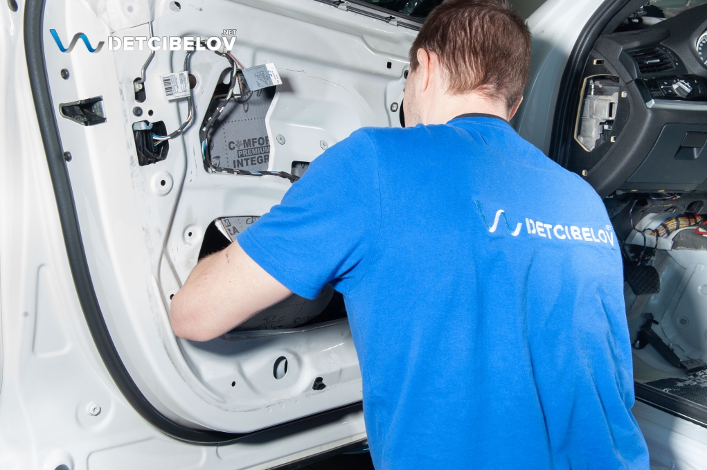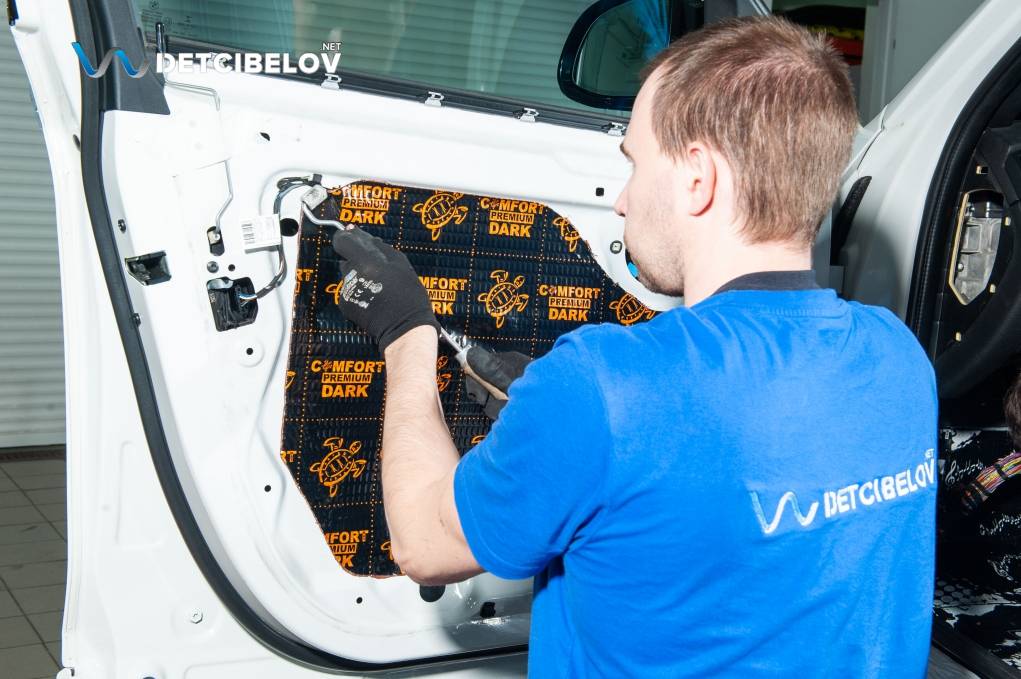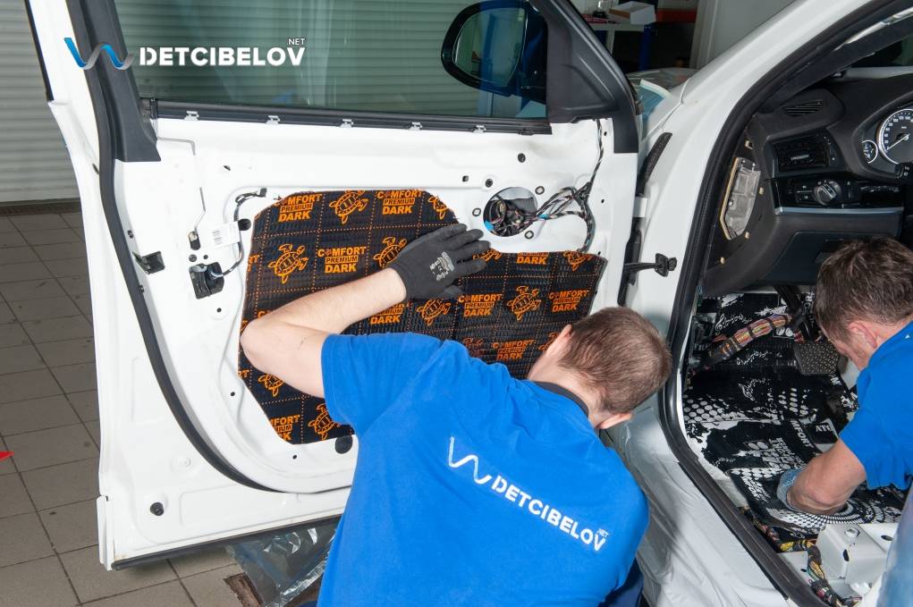 Работы по шумоизоляции начинаем с дверей. Максимально аккуратно разбираем дверные обшивки. После этого подготавливаем поверхность и обезжириваем все участки, на которые будут последовательно наноситься 4 слоя виброизоляционных материалов. Comfort mat Dark D3 Premium (3 мм) – облегченный виброизолятор. Comfort mat Integra (6 мм) – мембранная звукоизоляция, самая легкая из всех существующих. Сочетает в себе звуко и теплоизолирующие свойства за счет применения уникальной акустической мембраны и многослойной структуры. Comfort mat Fusion Red (3 мм) – шумопоглощающий материал. Comfort mat Wave Expert (15 мм) – шумопоглощающий материал последнего поколения, который наносится на карты дверей. Эта пенополиуретановая пенорезина с увеличенным коэффициентом шумопоглощения окончательно задерживает посторонние шумы и одновременно выступает в роли антискрипа.