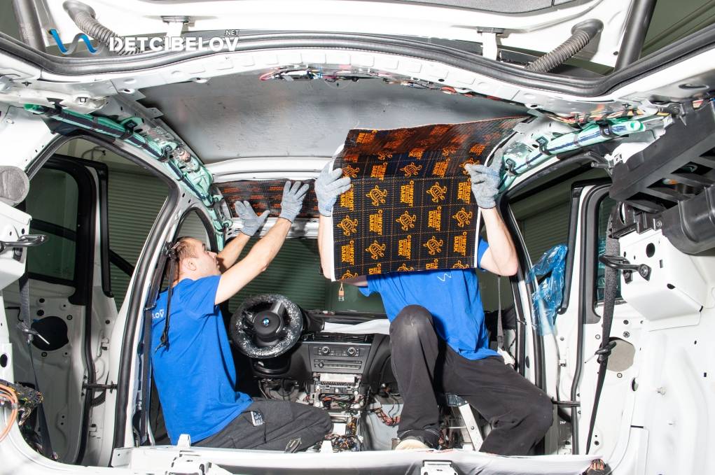 Следующий этап – шумоизоляция крыши. Максимально аккуратно чистыми одноразовыми перчатками демонтируем потолочную обшивку и обезжириваем поверхность потолка. После предварительной подготовки приступаем к шумоизоляции. Comfort mat Dark D3 Premium (3 мм) – облегченный виброизолятор. Comfort mat Felton (10 мм) – один из лучших звукопоглощающих материалов, который изготовлен из особого акустического войлока повышенной плотности по технологии термического скрепления. Одновременно 2 и 3 слой шумоизоляции дополнительно армирован ламинированным нетканым полотном.