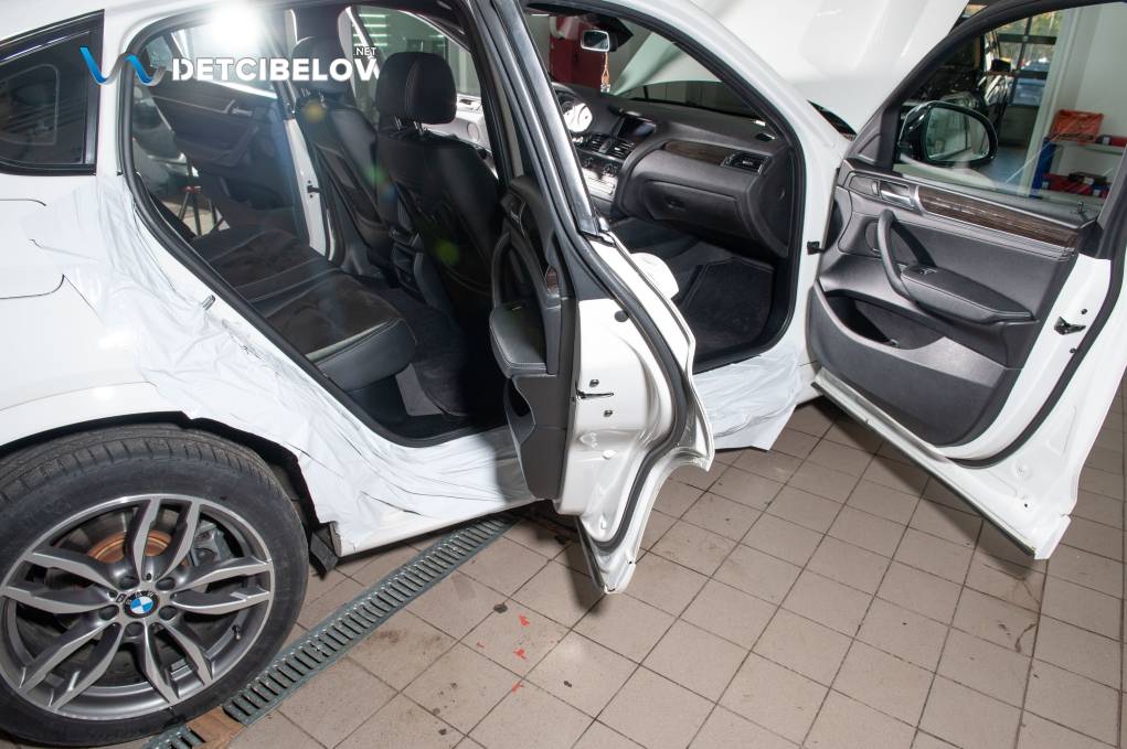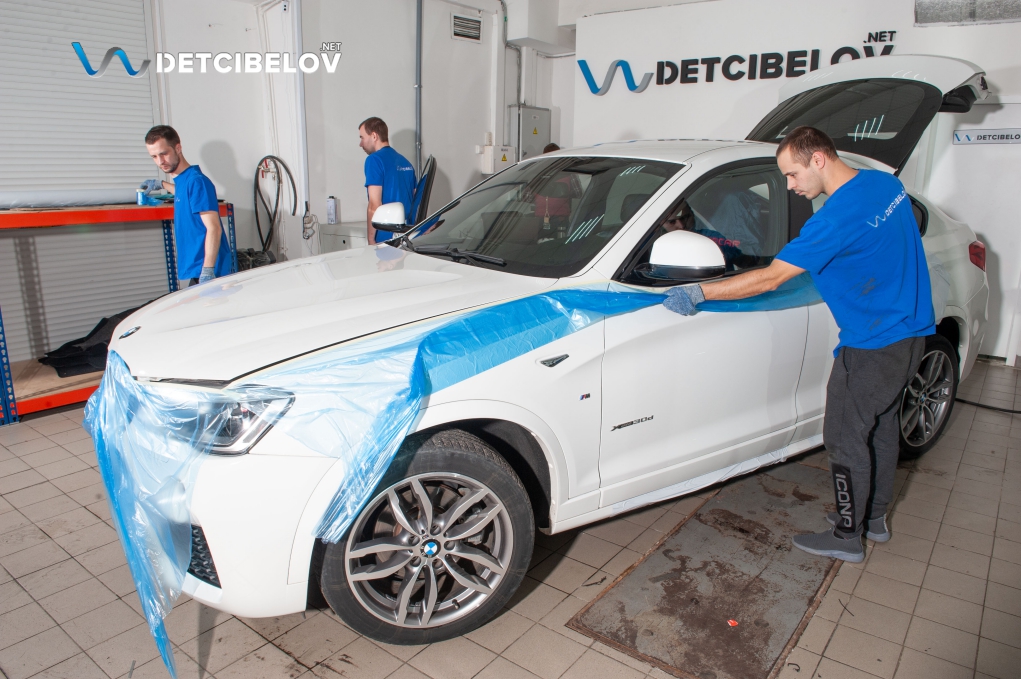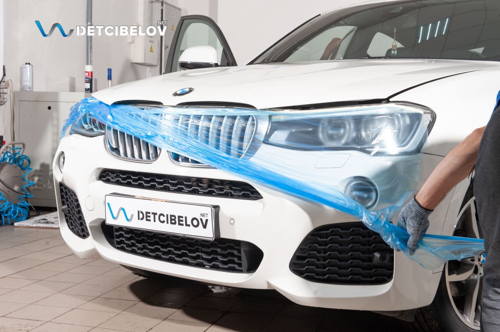 Приступаем к работе. Первым делом максимально защищаем автомобиль: оклеиваем пленкой все внешние элементы автомобиля, затем наносим скотч на пороги и арки дверей, упаковываем все мелкие пластиковые элементы в стретч-пленку. Сиденья и карты дверей помещаем в специальные чехлы.