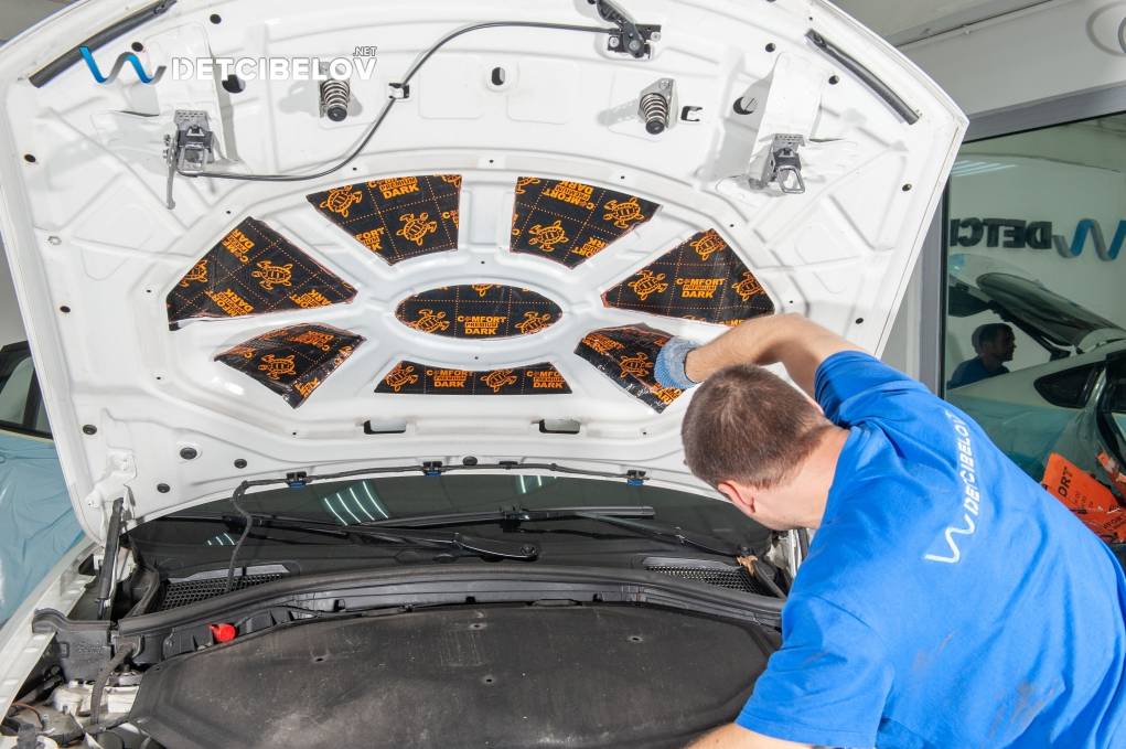 После шумоизоляции потолка переходим к работе над капотом и крышкой багажника. Внутреннюю поверхность капота обрабатываем материалом Comfort mat Dark D3 Premium (3 мм), а на штатную шумотеплоизоляцию мы наклеили Comfort mat Fusion Red (3 мм). Comfort mat Wave Expert (15 мм) - материал с увеличенным коэффициентом шумопоглощения, наносим на пластиковую панель.