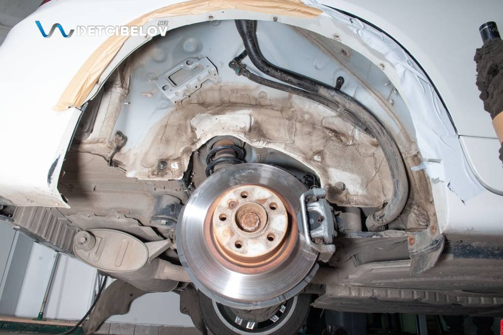 Финальным этапом шумоизоляции BMW X4 (F26) будет шумоизоляция колесных арок. Это позволит нам существенно усилить эффект снижения шума, издаваемого резиной автомобиля. Сначала снимаем 4 подкрылка, обезжириваем их поверхность и наносим следующие слои. Comfort mat Extreme 3.5 – многослойный вибродемпфер, каждый слой которого несет особую функциональную нагрузку. Затем наносим слой напыляемого полимера с резиновой крошкой и минеральными волокнами. Заливаем все швы и получаем после высыхания эластично-упругое покрытие черного цвета.