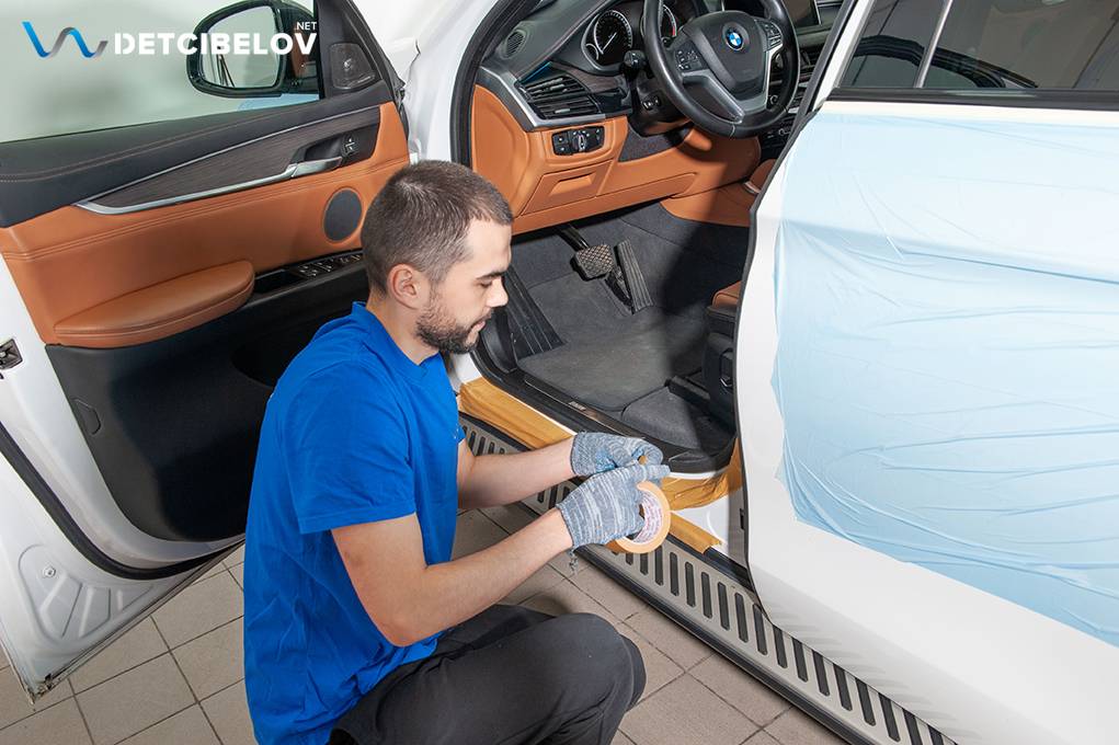 Приступаем к работе. Первым делом максимально защищаем автомобиль: оклеиваем пленкой все внешние элементы автомобиля, затем наносим скотч на пороги и арки дверей, упаковываем все мелкие пластиковые элементы в стретч-пленку. Сиденья и карты дверей помещаем в специальные чехлы.