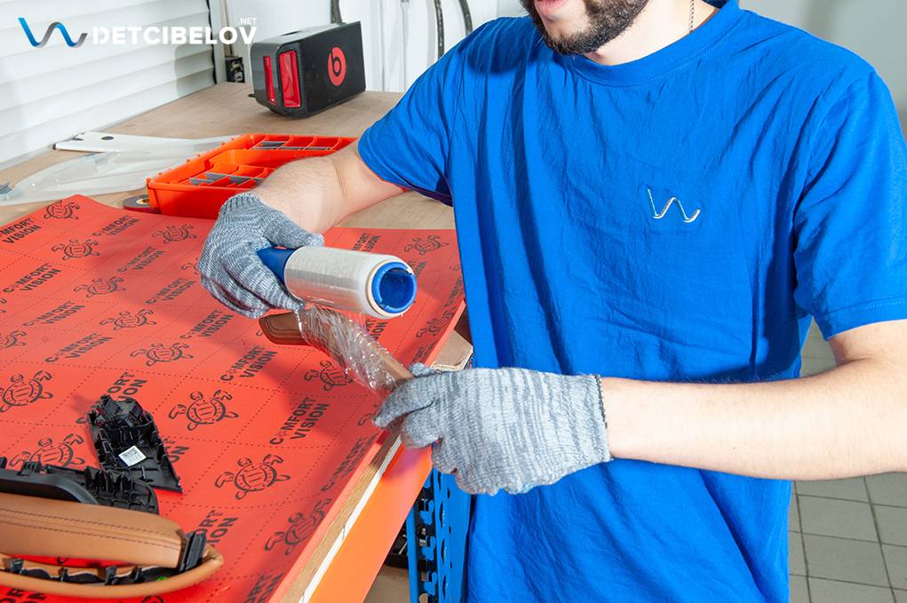 Для виброизоляция пола мы используем вибродемпфер Comfort mat Extreme 3.5 — это мастично битумный сендвич с рекордной толщиной 3,5 мм и двумя слоями фольги, который убирает низкочастотные структурные шумы металла. Это «Царь» среди виброизоляционных материалов, с уникальной структурой мастики и лучшими показателями снижения вибрации. Нагреваем его при температуре 60-80 градусов в специальной печи,