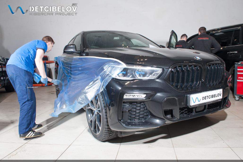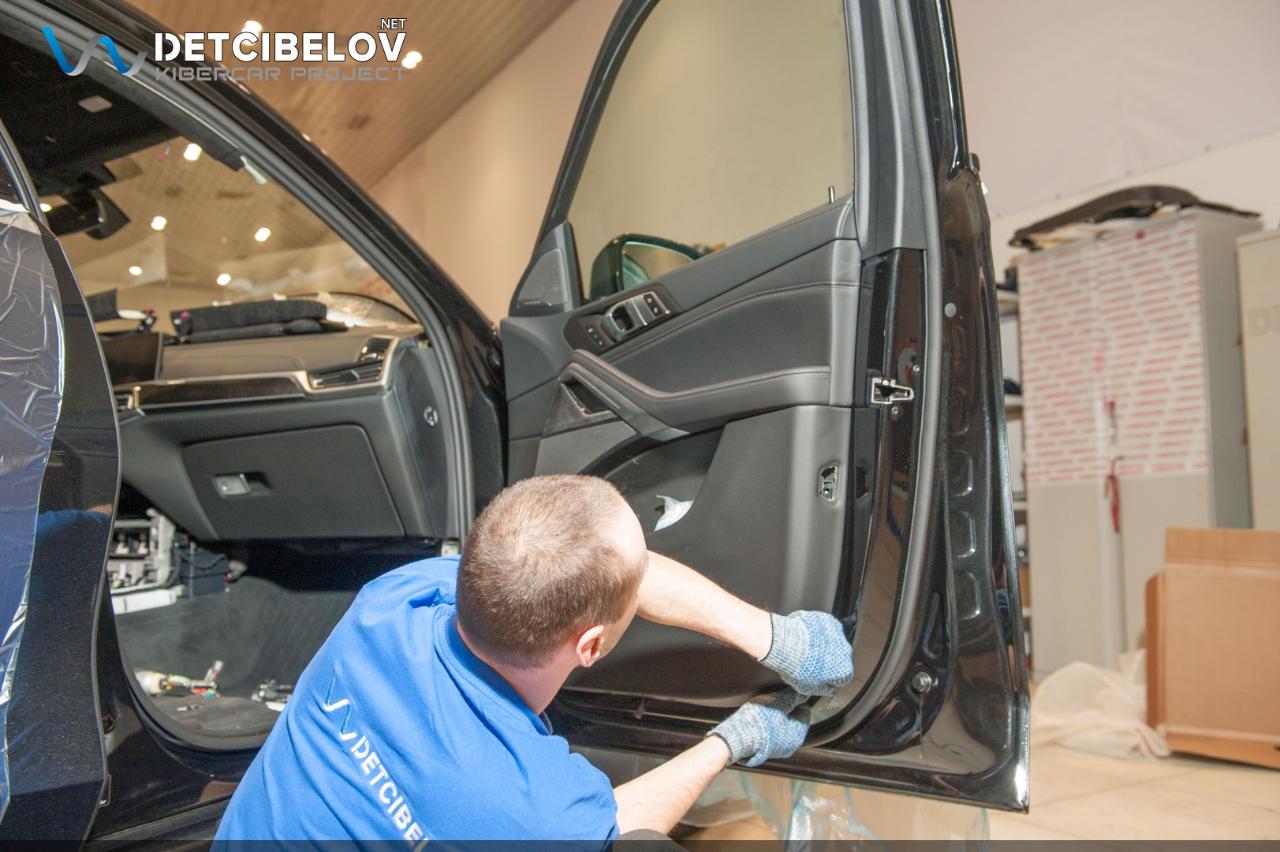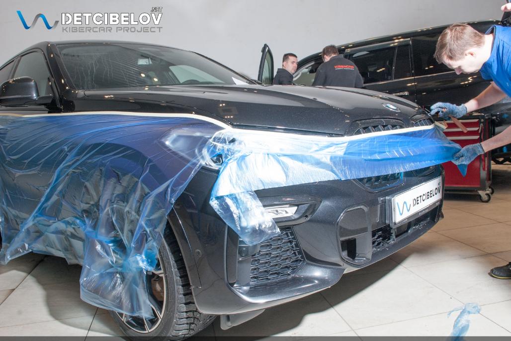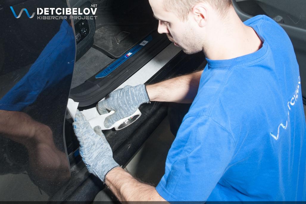 Приступаем к работе. Первым делом максимально защищаем автомобиль: оклеиваем пленкой все внешние элементы автомобиля, затем наносим скотч на пороги и арки дверей, упаковываем все мелкие пластиковые элементы в стретч-пленку. Сиденья и карты дверей помещаем в специальные чехлы.