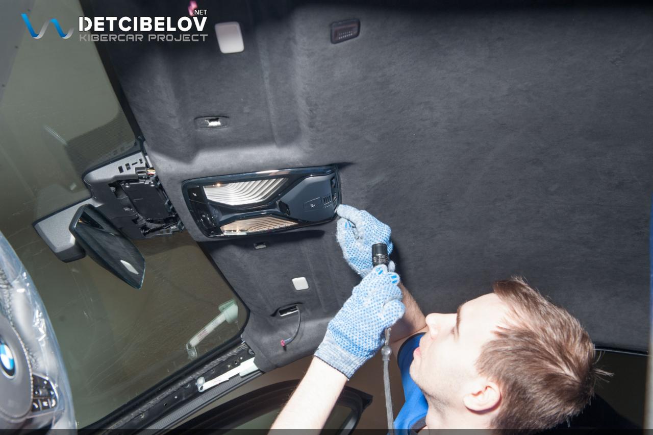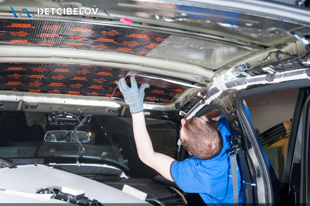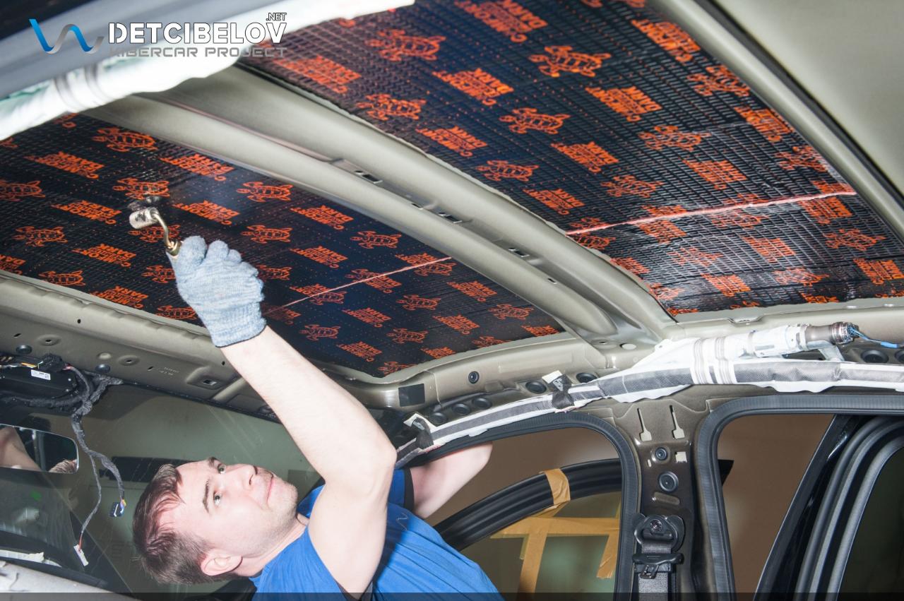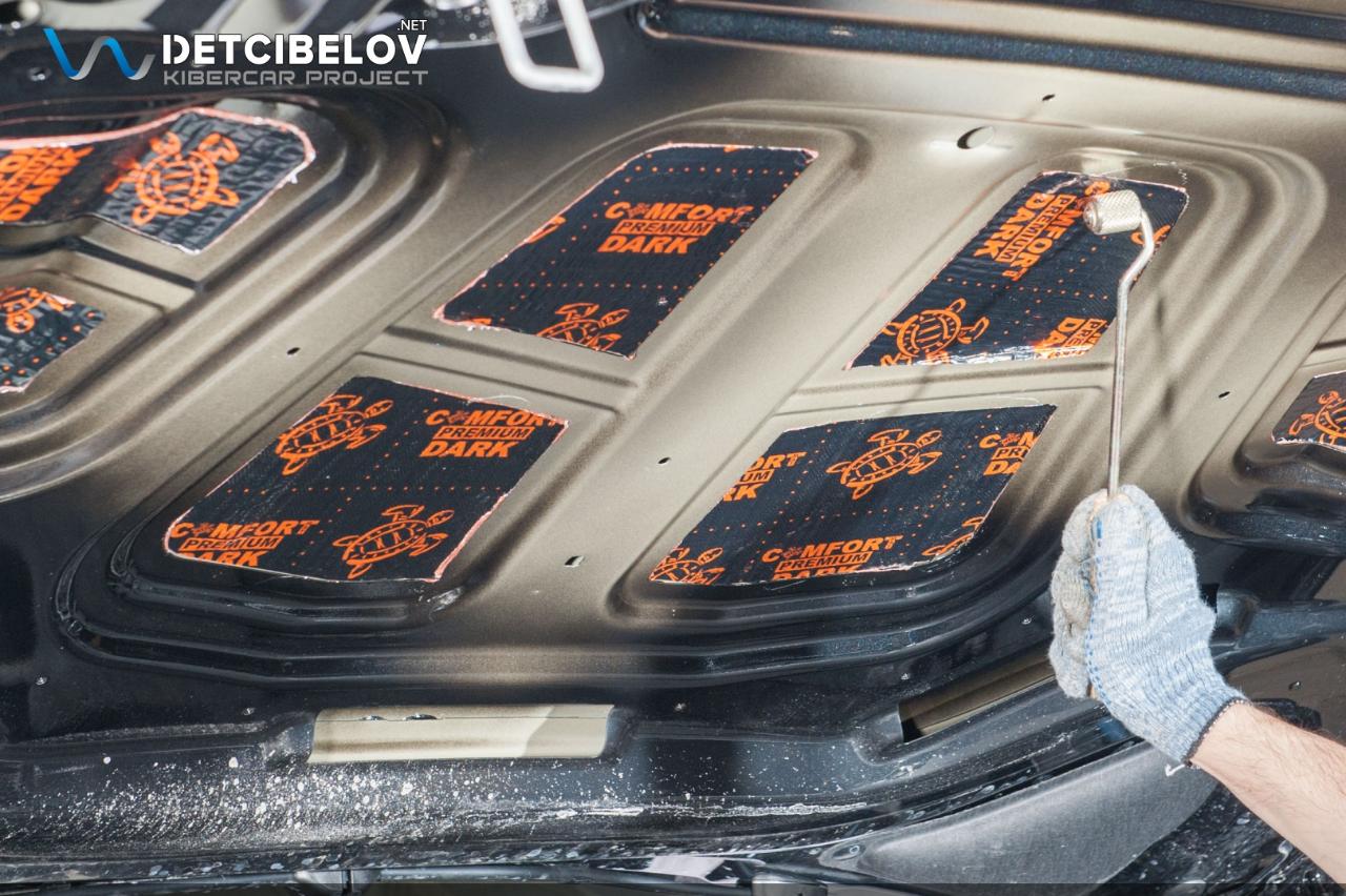 Следующий этап – шумоизоляция крыши. Максимально аккуратно чистыми одноразовыми перчатками демонтируем потолочную обшивку и обезжириваем поверхность потолка. После предварительной подготовки приступаем к шумоизоляции. Comfort mat Dark D3 Premium (3 мм) – облегченный виброизолятор. Comfort mat Skyline (5 мм) – мембранная звукоизоляция, которая выполнена на современном монтажном клее-герметике последнего поколения.