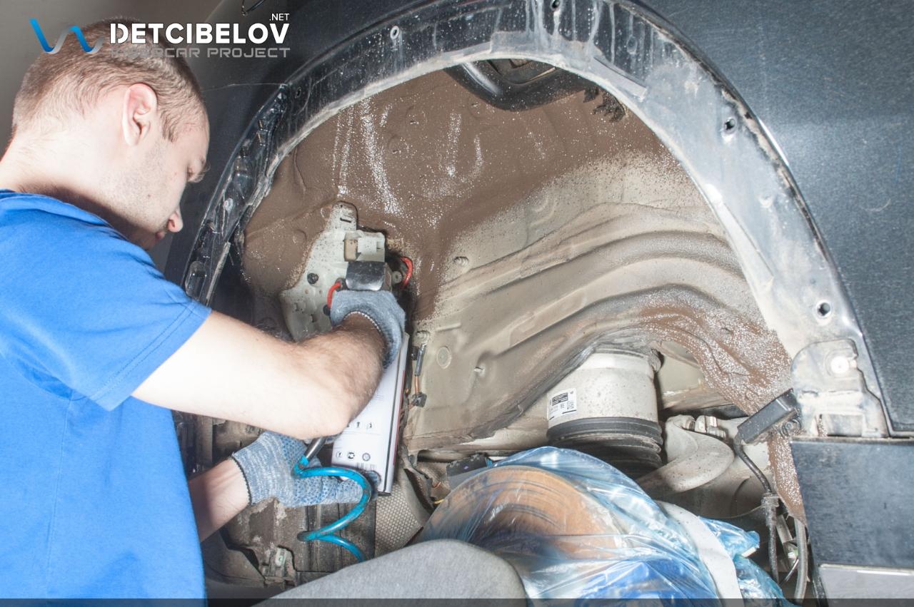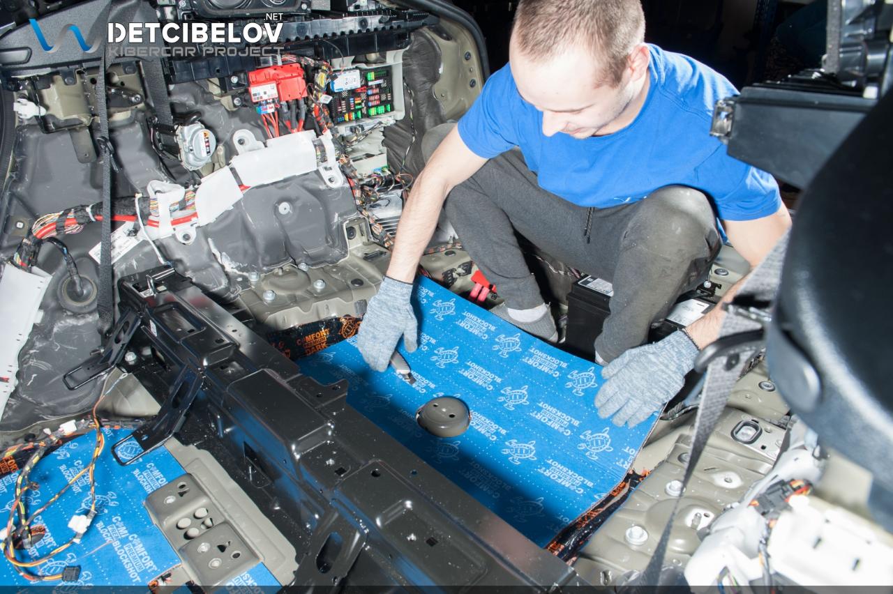Далее приступаем к самой ответственной части шумоизоляии автомобиля - пола, багажника и внутренних колесных арок. Данный этап начинается с полного демонтажа сидений, ковров, обшивок и т.д., ничего не должно мешать проводимым работам. Начинаем работы с первого, виброизолирующего, идет нагрев этого материала в печке и дальнейший монтаж.