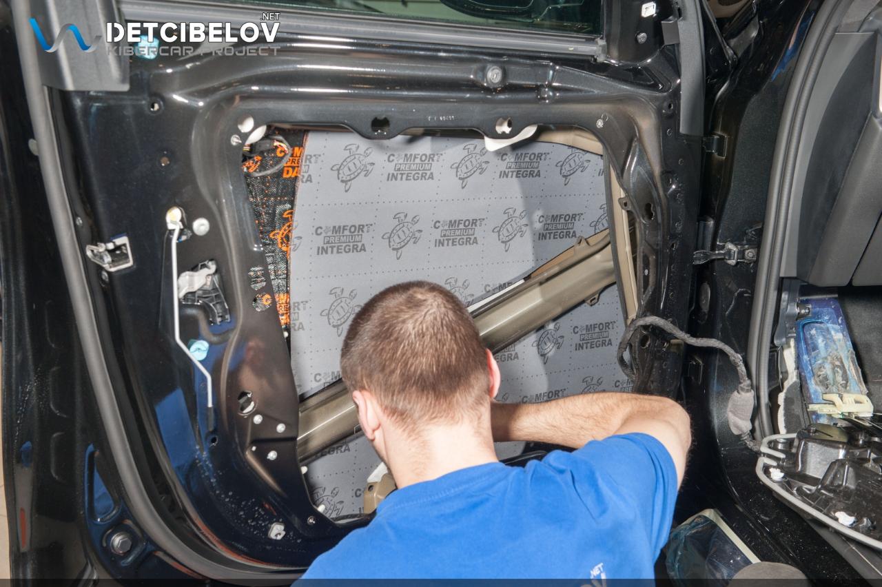 Работы по шумоизоляции начинаем с дверей. Максимально аккуратно разбираем дверные обшивки. После этого подготавливаем поверхность и обезжириваем все участки, на которые будут последовательно наноситься слои виброизоляционных материалов. Comfort mat Dark D3 Premium (3 мм) – облегченный виброизолятор. Comfort mat Dark D3 Premium (3 мм) – облегченный виброизолятор. Comfort mat Integra (6 мм) – мембранная звукоизоляция, самая легкая из всех существующих. Сочетает в себе звуко и теплоизолирующие свойства за счет применения уникальной акустической мембраны и многослойной структуры. Comfort mat Wave Expert (15 мм) – шумопоглощающий материал последнего поколения, который наносится на карты дверей. Эта пенополиуретановая пенорезина с увеличенным коэффициентом шумопоглощения окончательно задерживает посторонние шумы и одновременно выступает в роли антискрипа.