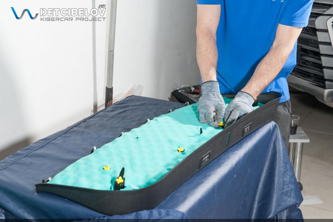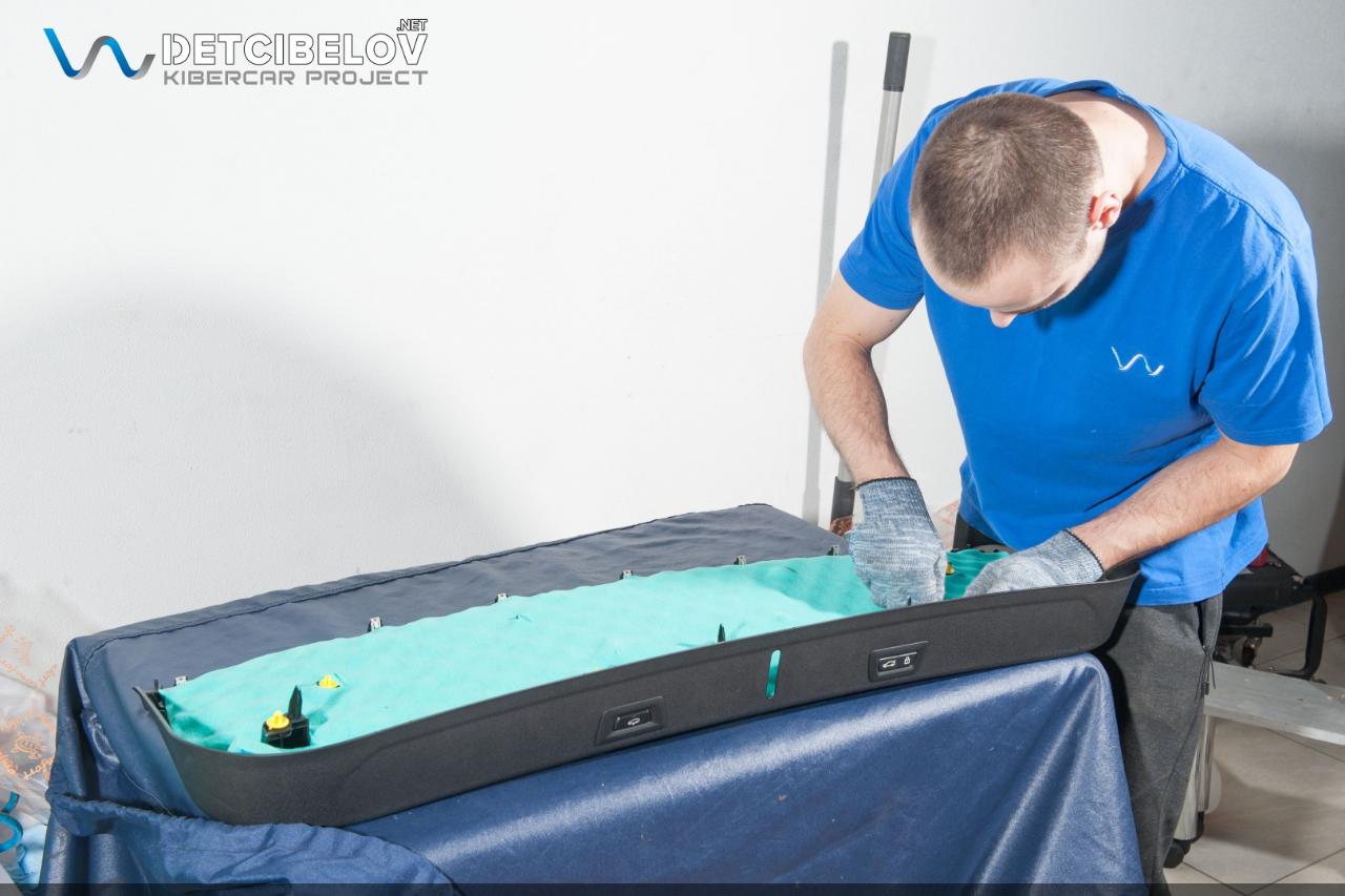 После шумоизоляции пола и зоны багажника переходим к работе над капотом и крышкой багажника. Внутреннюю поверхность капота обрабатываем материалом Comfort mat Dark D3 Premium (3 мм), а на штатную шумотеплоизоляцию мы наклеили Comfort mat Fusion Red (3 мм). Comfort mat Wave Expert (15 мм) – шумопоглощающий материал последнего поколения, который мы наклеили на пластиковую панель. Эта пенополиуретановая пенорезина с увеличенным коэффициентом шумопоглощения окончательно задерживает посторонние шумы и одновременно выступает в роли антискрипа.