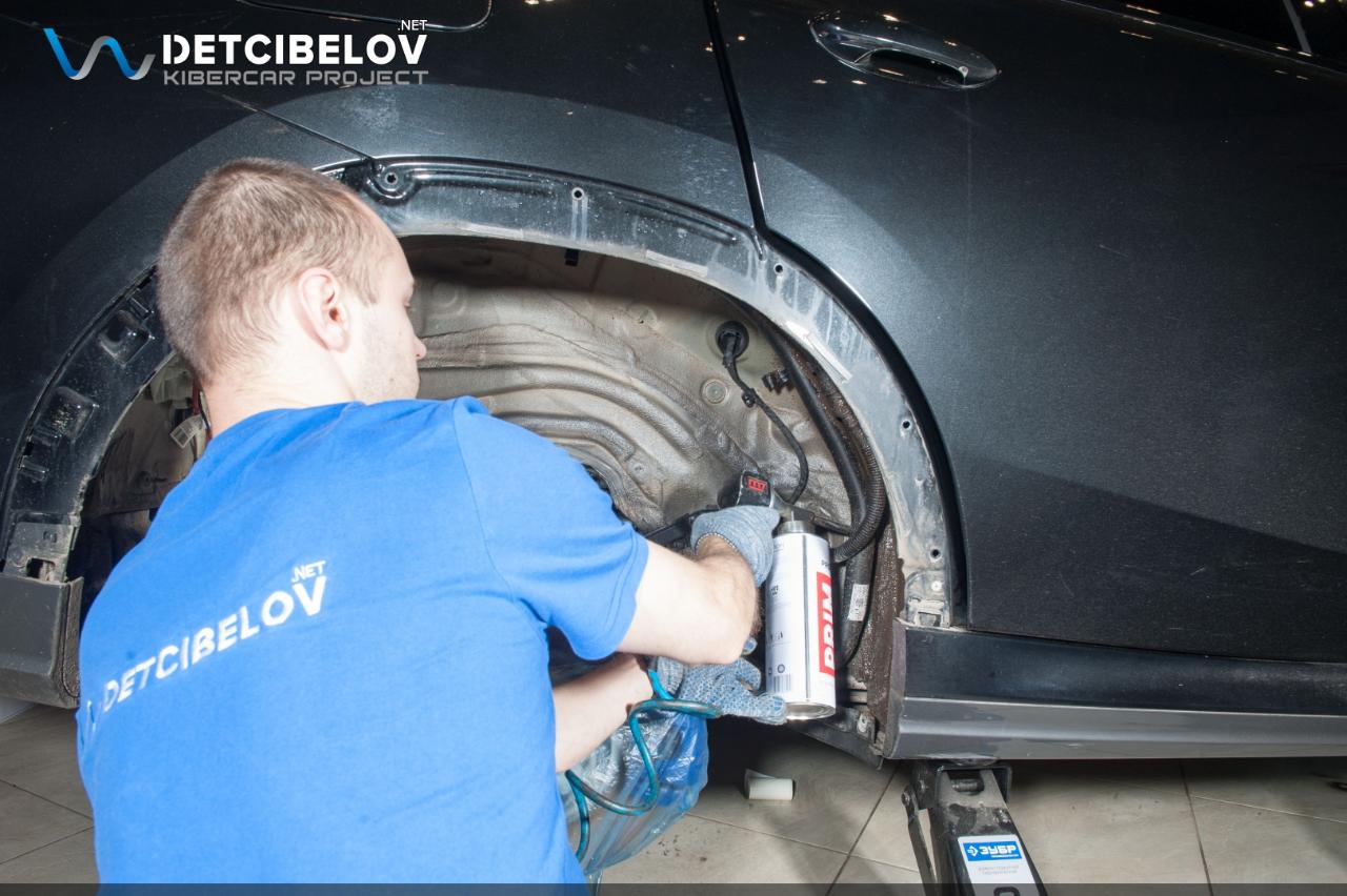 Финальным этапом шумоизоляции BMW X6 G06 будет шумоизоляция колесных арок. Это позволит нам существенно усилить эффект снижения шума, издаваемого резиной автомобиля. Сначала снимаем 4 подкрылка и обезжириваем их поверхность. Наносим слой напыляемого полимера с резиновой крошкой и минеральными волокнами. Заливаем все швы и получаем после высыхания эластично-упругое покрытие черного цвета.