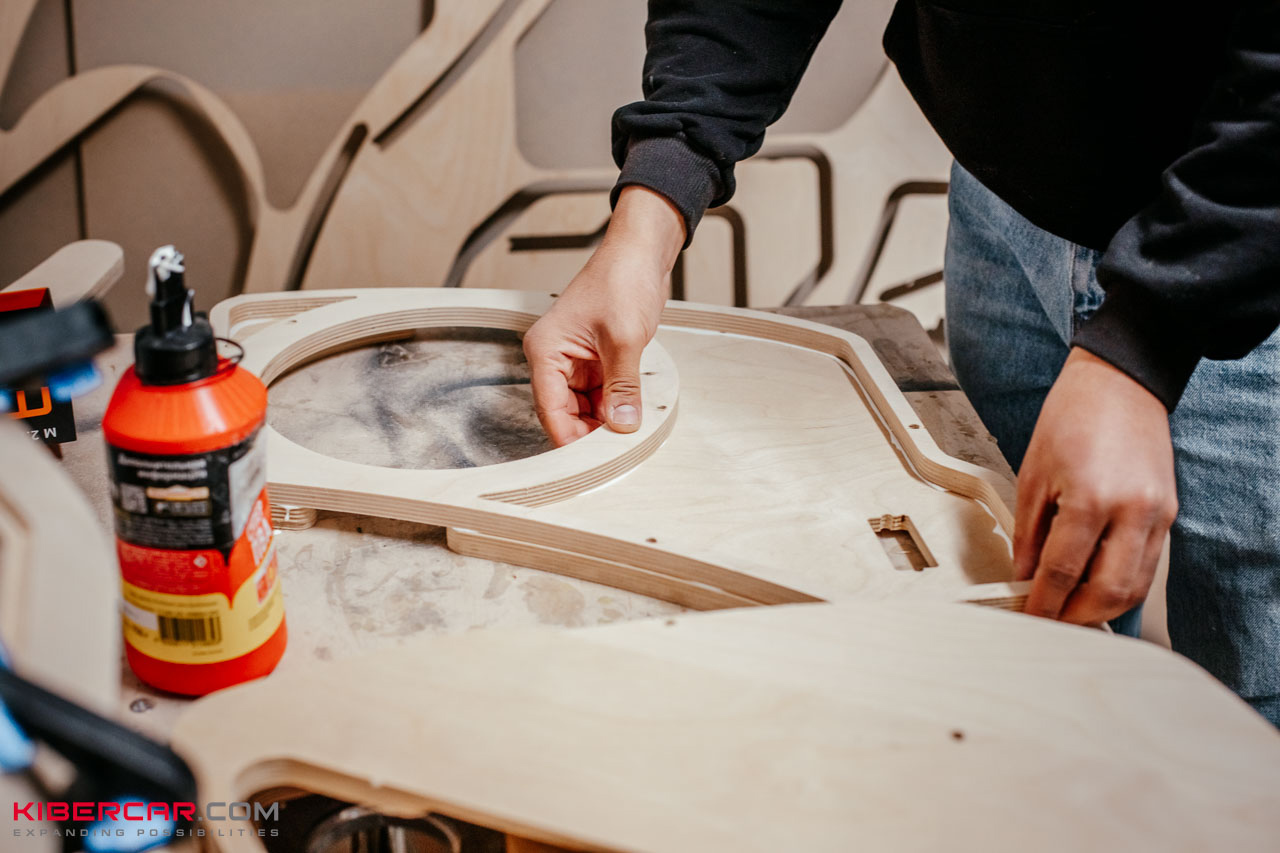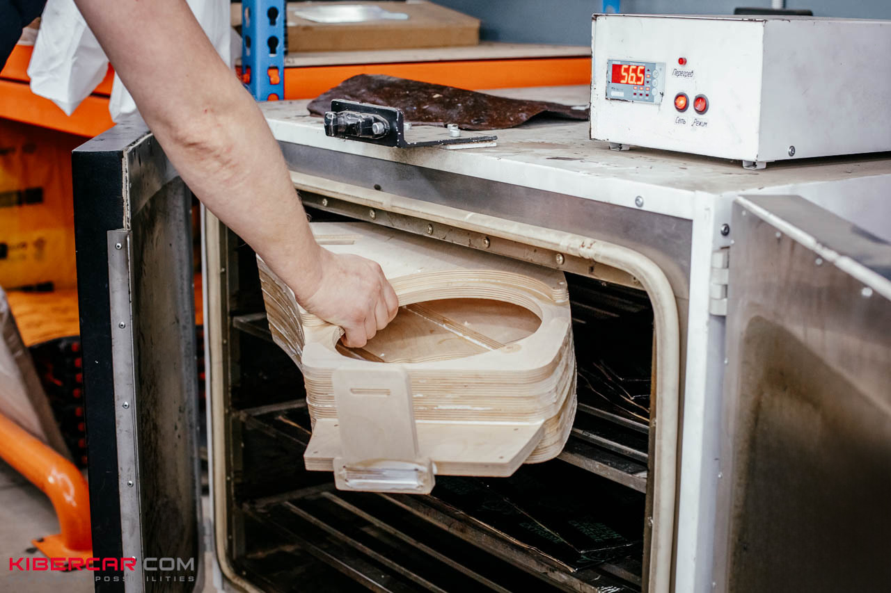 Готовые элементы склеиваются без саморезов. Для этого используются деревянные шканты. Для фиксации конструкции применяются струбцины. Когда клей схватится, корпус зашлифовывается и отправляется на покраску. В обязательном порядке проводится проверка ОТК – короб должен быть герметичным. Кроме того, мы его гидроизолируем, а на лицевую панель наносим карпет, чтобы предотвратить скрипение.