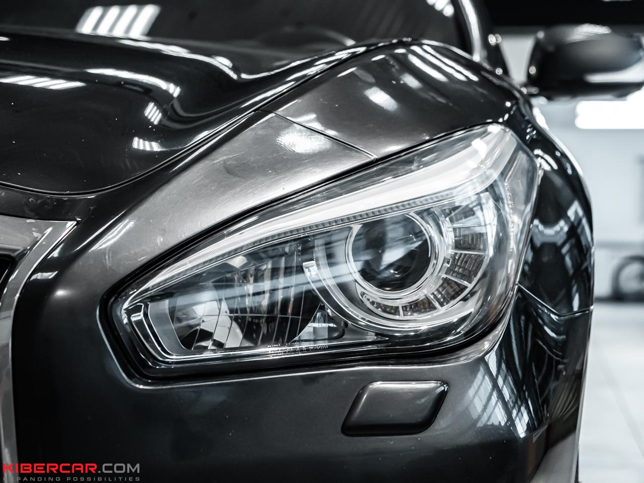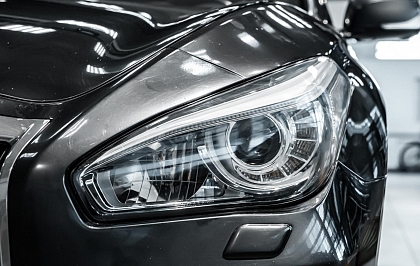 Это не обязательный этап и проводится по согласованию с клиентом. Мы делаем химическую полировку фары, убираем царапины, затертости, помутнения – после этого стекло фары становится как новое. Чтобы защитить стекло фары от дальнейшего воздействия, мы наносим специальную полиуретановую пленку с самовосстанавливающимся покрытием.