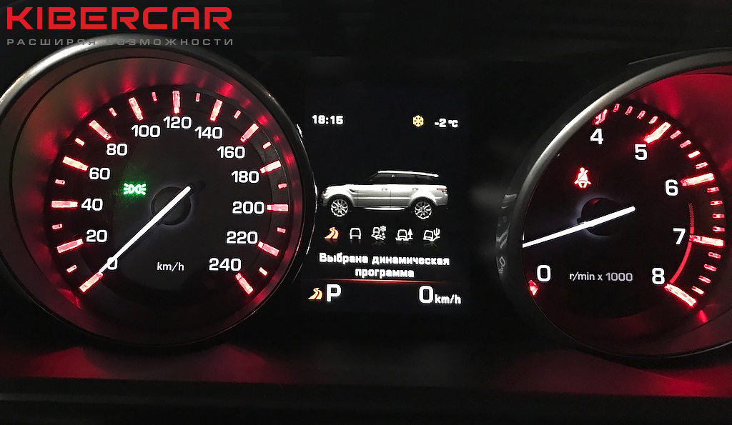 Режим Dynamic — изначально скрытый режим в конфигурации автомобиля, который позволяет раскрыть новые динамические качества вашего Land Rover. При включении режима приборная панель меняет цвет на красный.