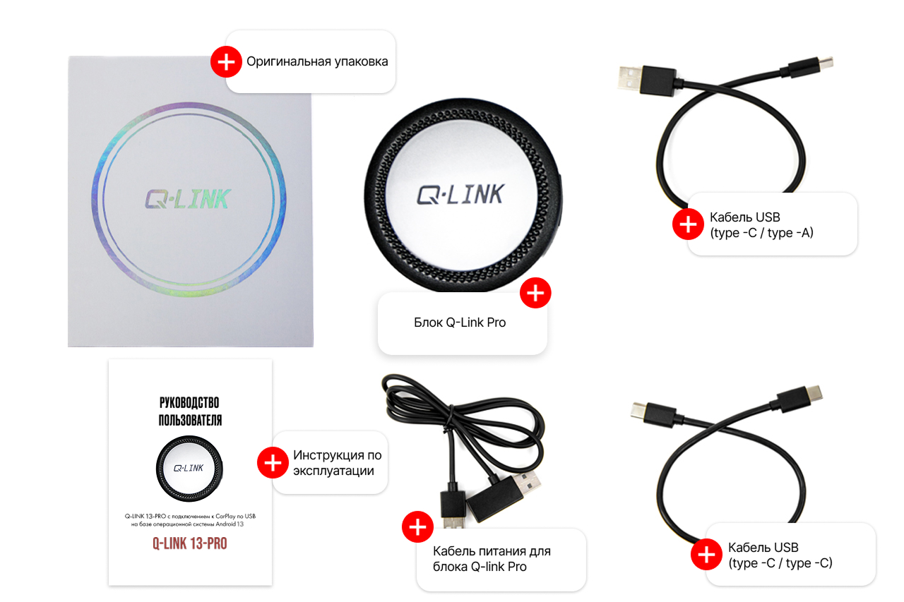 Подключите устройство Q-link к разъему USB автомобиля, через кабель для передачи данных USB – USB или USB – USB Тип С (идет в комплекте). Индикатор работы устройства включится и загорится красным цветом, указывая на успешный запуск. Когда дисплей автомобиля подключится к устройству, на дисплее появится сообщение об успешном подключении к системе автомобиля.