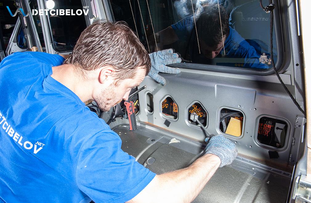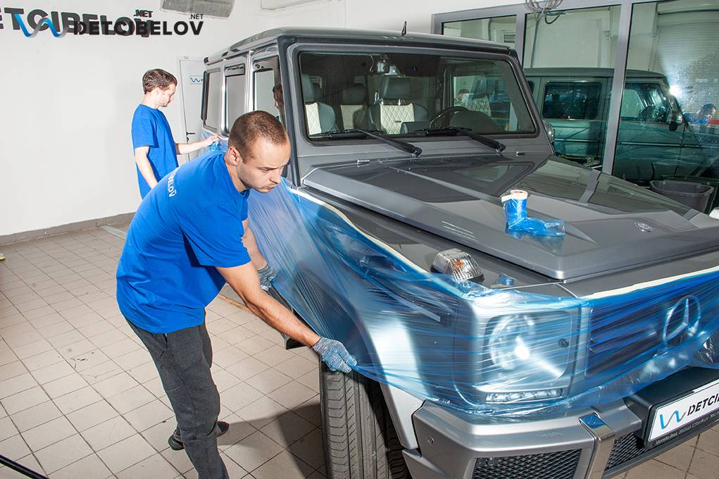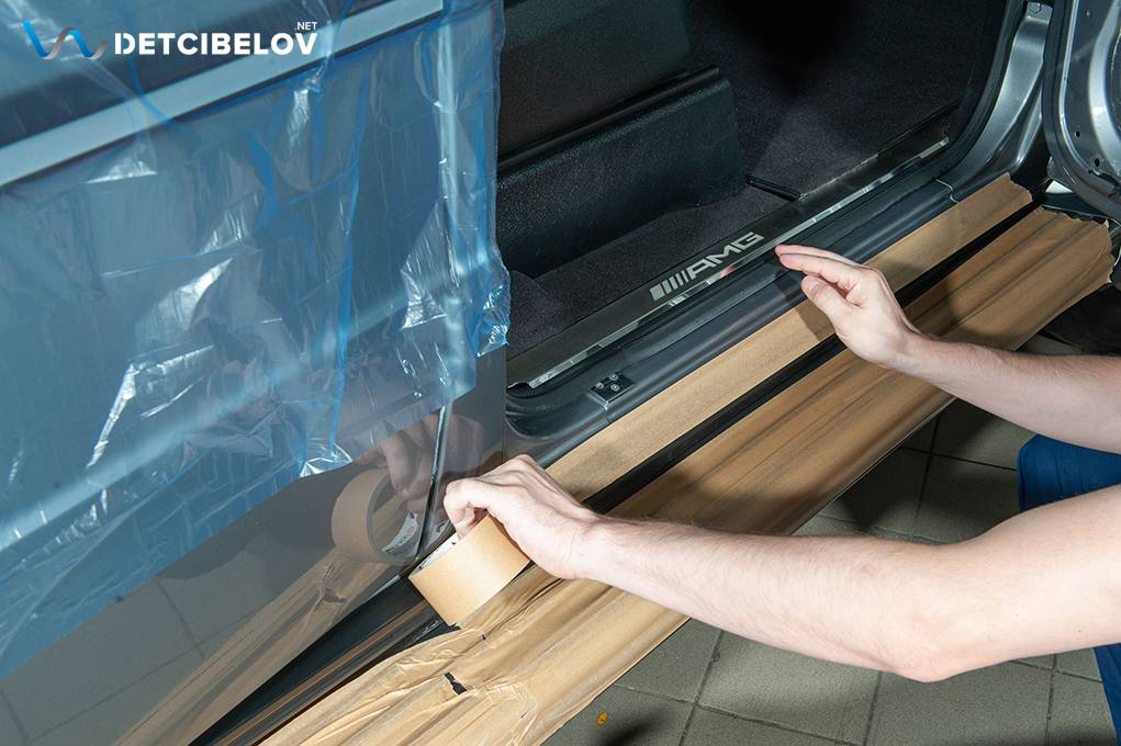 Приступаем к работе. Первым делом максимально защищаем автомобиль: оклеиваем пленкой все внешние элементы автомобиля, затем наносим скотч на пороги и арки дверей, упаковываем все мелкие пластиковые элементы в стретч-пленку. Сиденья и карты дверей помещаем в специальные чехлы.