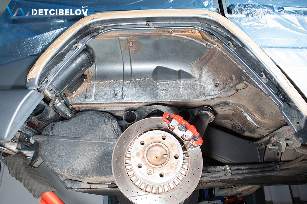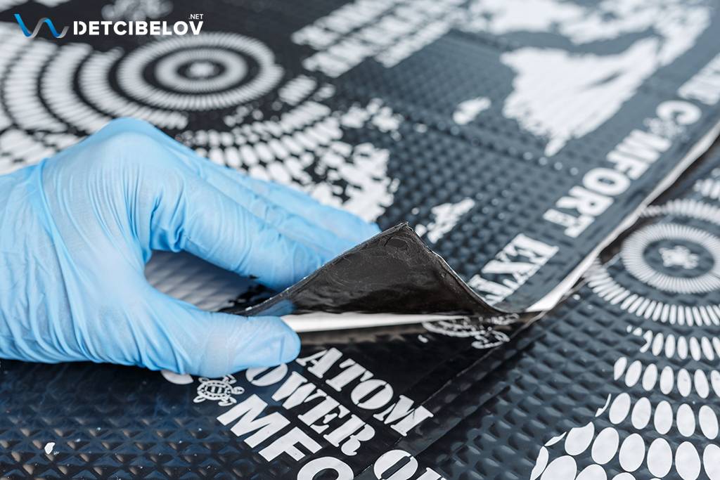 Для виброизоляции пола мы используем вибродемпфер Comfort mat Extreme 3.5 — это мастичнобитумный сэндвич с рекордной толщиной 3,5 мм и двумя слоями фольги, которые убирают низкочастотные структурные шумы металла. Это «Царь» среди виброизоляционных материалов с уникальной структурой мастики и лучшими показателями снижения вибрации. Нагреваем его при температуре 60-80 градусов в специальной печи – это обязательное условие, иначе качественно нанести этот материал не удастся. Его мы используем на полу в салоне.