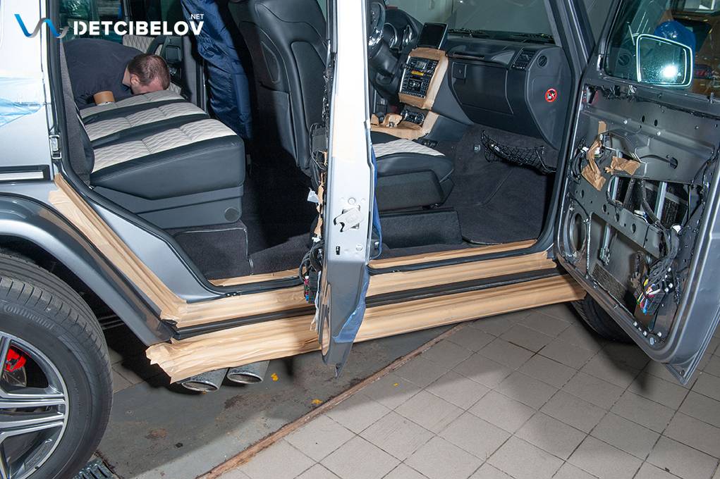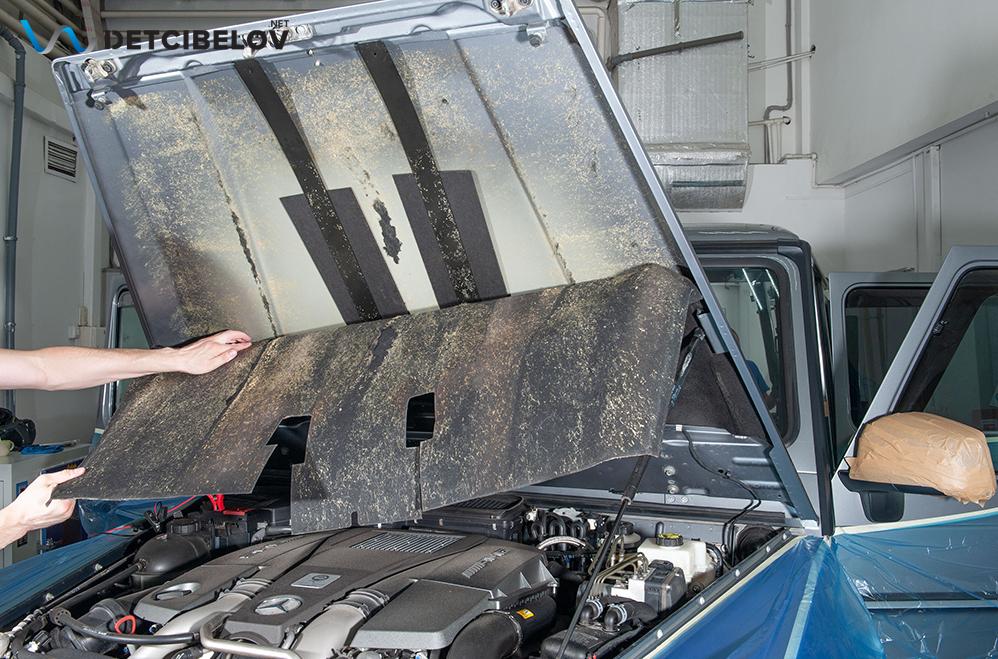 Финальным этапом шумоизоляции Mercedes-Benz G-Класса будет шумоизоляция колесных арок. Это позволит нам существенно усилить эффект снижения шума, издаваемого резиной автомобиля. Сначала снимаем 4 подкрылка, обезжириваем их поверхность и наносим следующие слои. Comfort mat Extreme 3.5 – многослойный вибродемпфер, каждый слой которого несет особую функциональную нагрузку. Затем наносим слой напыляемого полимера с резиновой крошкой и минеральными волокнами. Заливаем все швы и получаем после высыхания эластично-упругое покрытие черного цвета. Comfort mat Vision Red (6 мм) – легкий, водонепроницаемый материал, обладающий высокими звукоизоляционными и шумопоглощающими свойствами, устойчивый к климатическим изменениям.