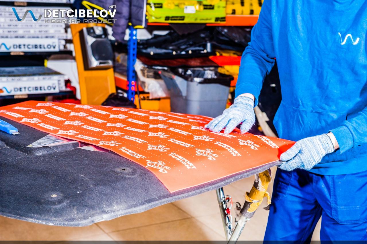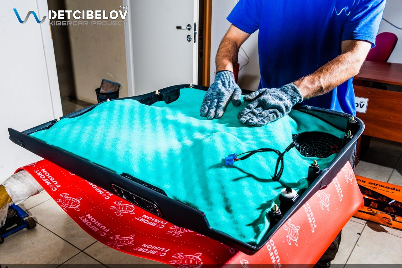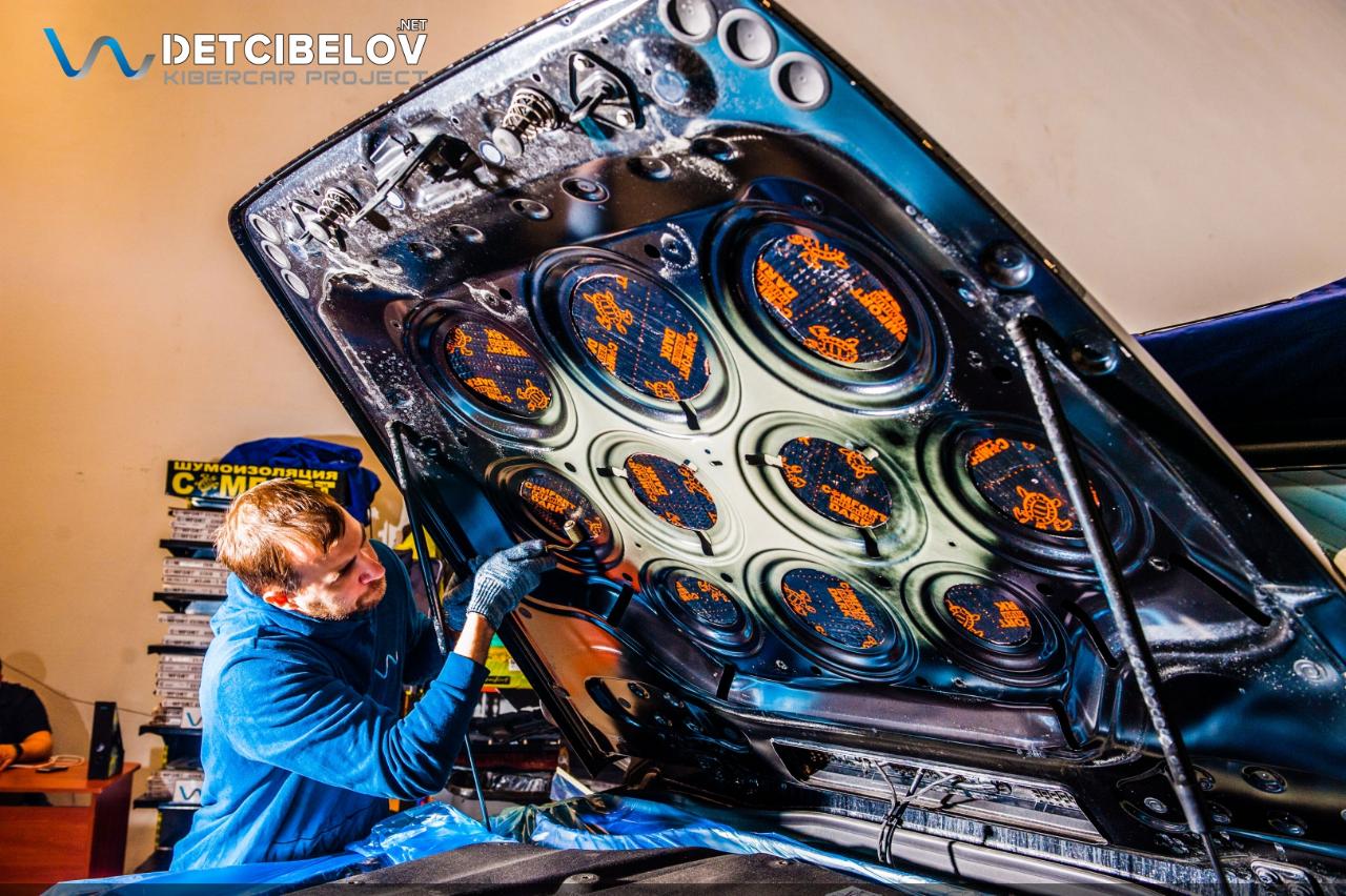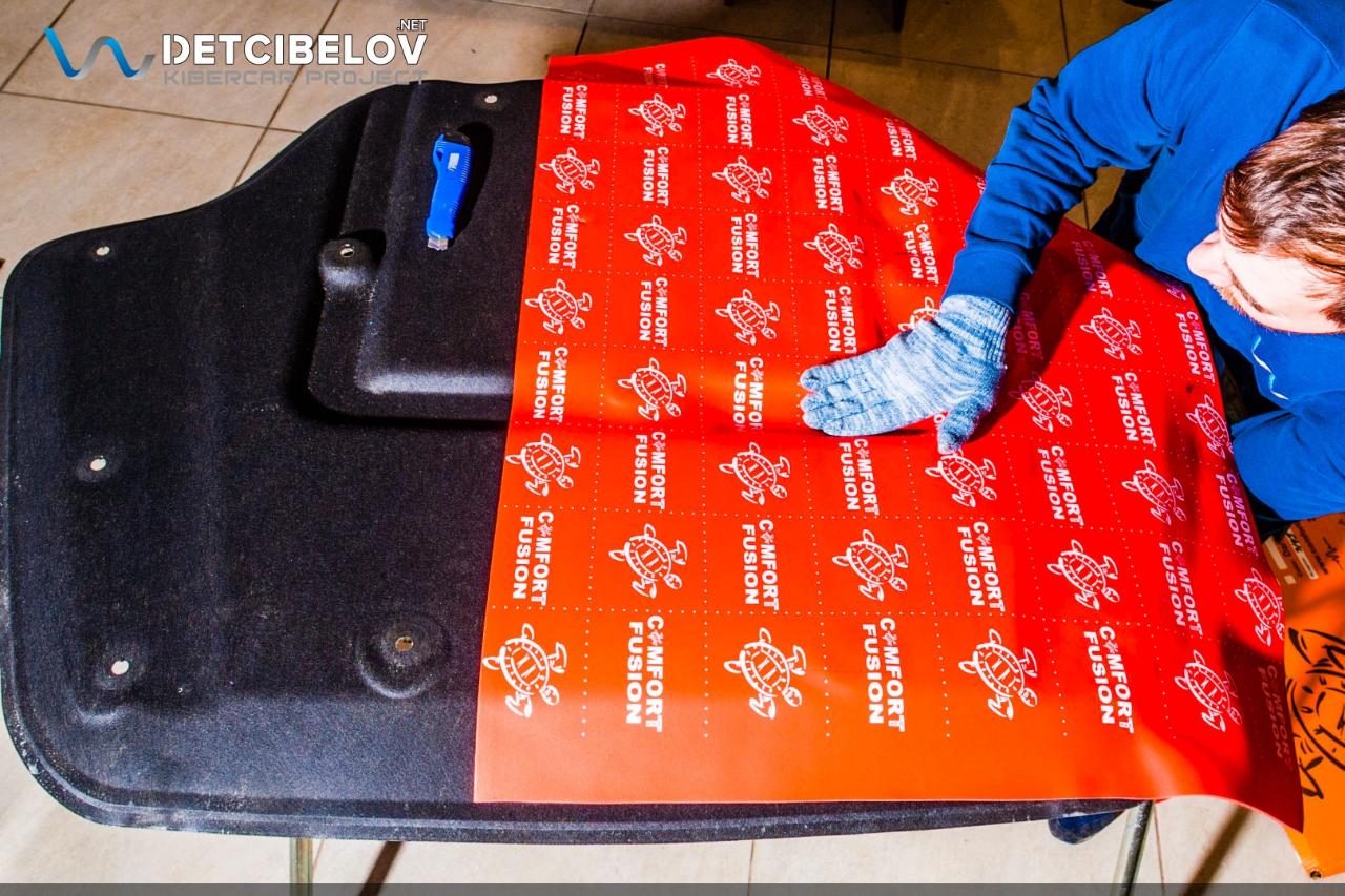 После шумоизоляции пола и зоны багажника переходим к работе над капотом и крышкой багажника. На крышку багажника мы демпферно нанесли Comfort mat Dark D3 Premium (3 мм), а на пластиковую панель наклеили Comfort mat Wave Expert (15 мм) с увеличенным коэффициентом шумопоглощения. Внутреннюю поверхность капота обрабатываем материалом Comfort mat Dark D3 Premium (3 мм), а на штатную шумотеплоизоляцию мы наклеили Comfort mat Fusion Red (3 мм).