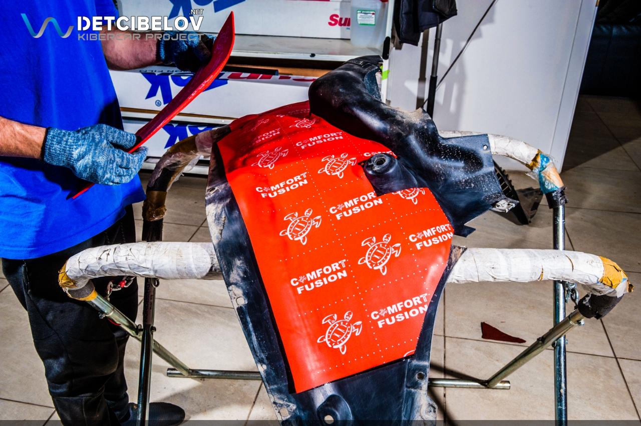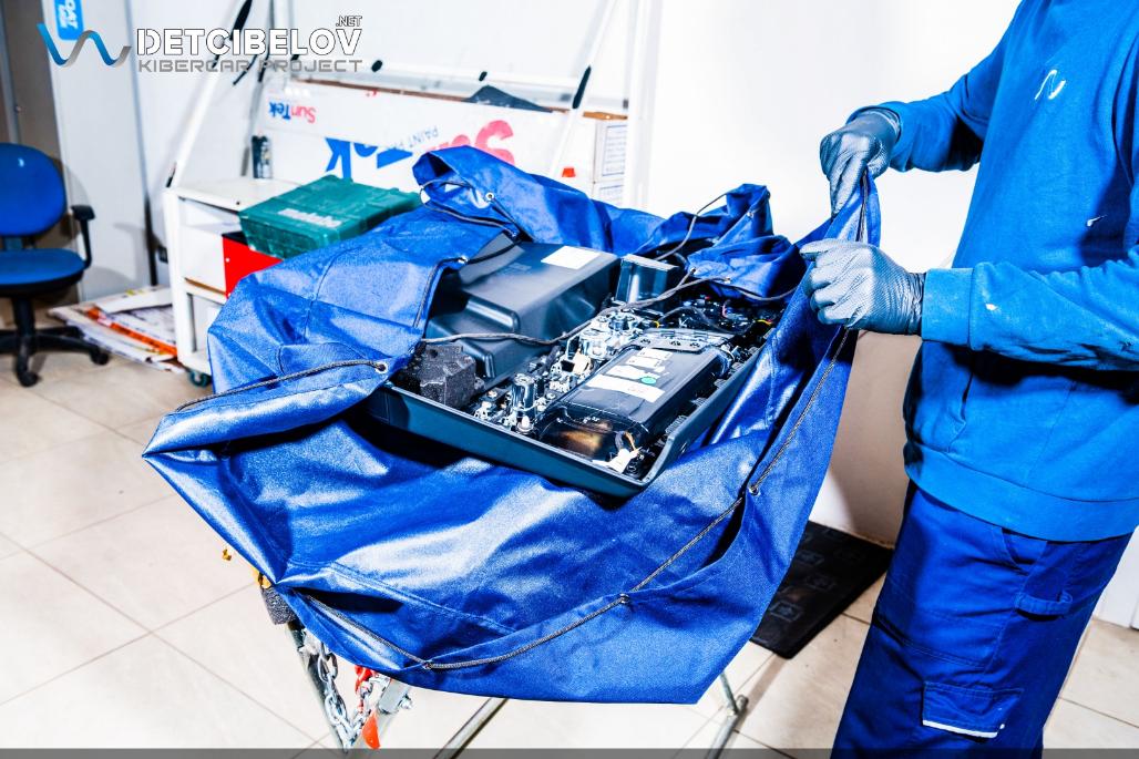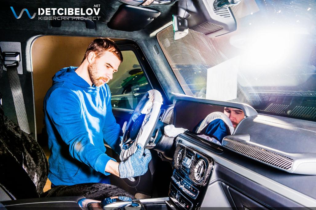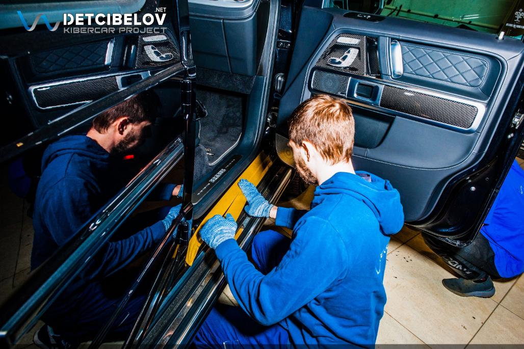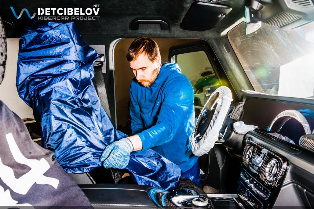 Приступаем к работе. Первым делом максимально защищаем автомобиль: оклеиваем пленкой все внешние элементы автомобиля, затем наносим скотч на пороги и арки дверей, упаковываем все мелкие пластиковые элементы в стретч-пленку. Сиденья и карты дверей помещаем в специальные чехлы.