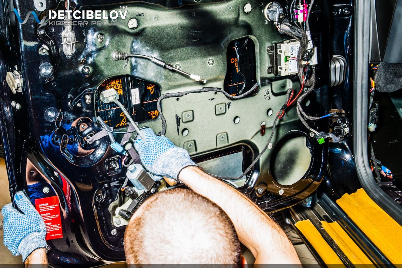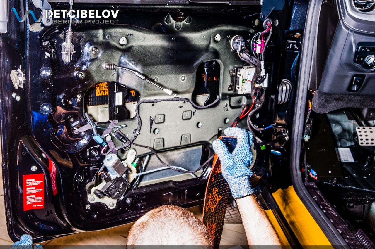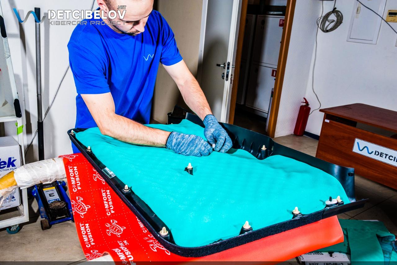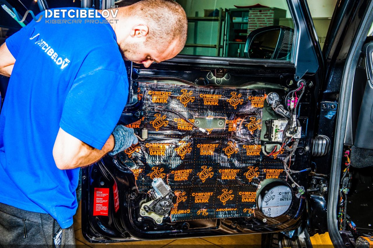 Работы по шумоизоляции начинаем с дверей. Максимально аккуратно разбираем дверные обшивки. После этого подготавливаем поверхность и обезжириваем все участки, на которые будут последовательно наноситься 4 слоя виброизоляционных материалов. Comfort mat Dark D3 Premium (3 мм) – облегченный виброизолятор. Comfort mat Integra (6 мм) – мембранная звукоизоляция, самая легкая из всех существующих. Сочетает в себе звуко и теплоизолирующие свойства за счет применения уникальной акустической мембраны и многослойной структуры. Comfort mat Dark D3 Premium (3 мм) – слой для оклеивания центральной вставки. Comfort mat Wave Expert (15 мм) – шумопоглощающий материал последнего поколения, который наносится на карты дверей. Эта пенополиуретановая пенорезина с увеличенным коэффициентом шумопоглощения окончательно задерживает посторонние шумы и одновременно выступает в роли антискрипа.