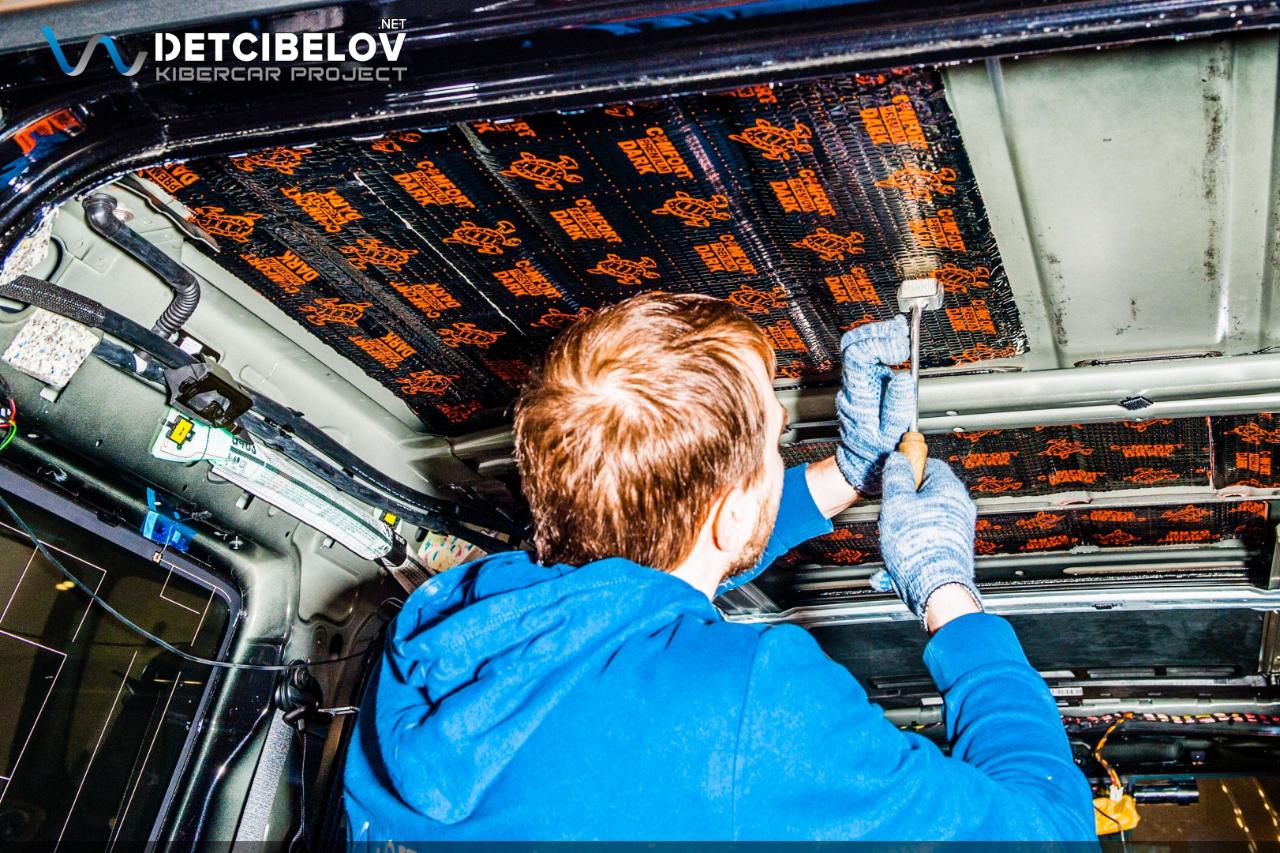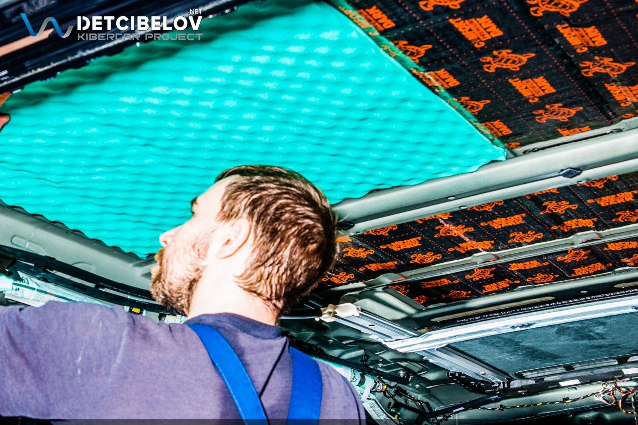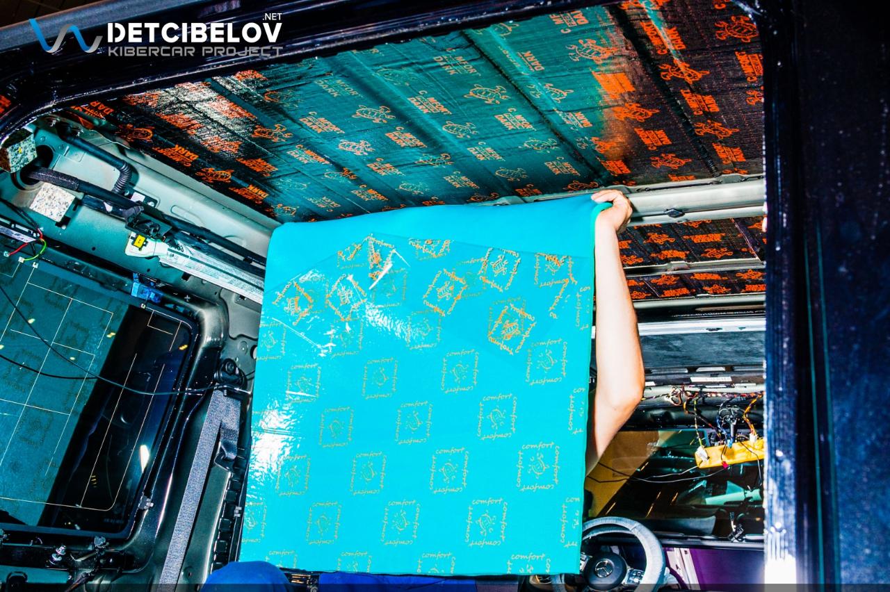 Следующий этап – шумоизоляция крыши. Максимально аккуратно чистыми одноразовыми перчатками демонтируем потолочную обшивку и обезжириваем поверхность потолка. После предварительной подготовки приступаем к шумоизоляции. Comfort mat Dark D3 Premium (3 мм) – облегченный виброизолятор. Comfort mat Wave Expert (15 мм) – шумопоглощающий материал, который обеспечивает не только шумо, но и теплоизоляцию.