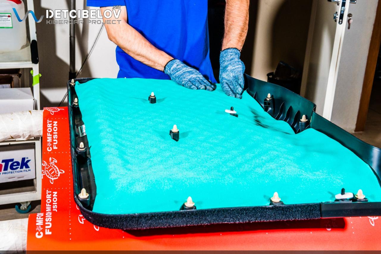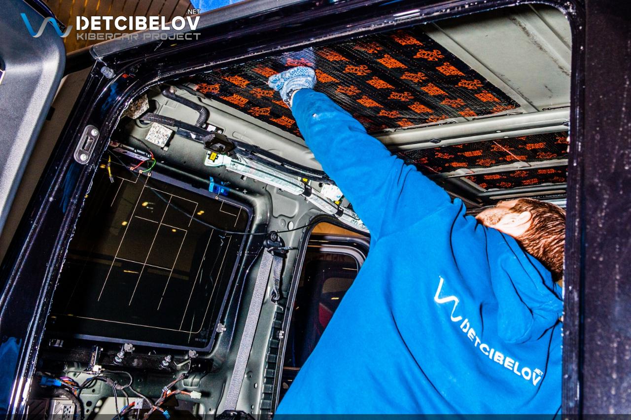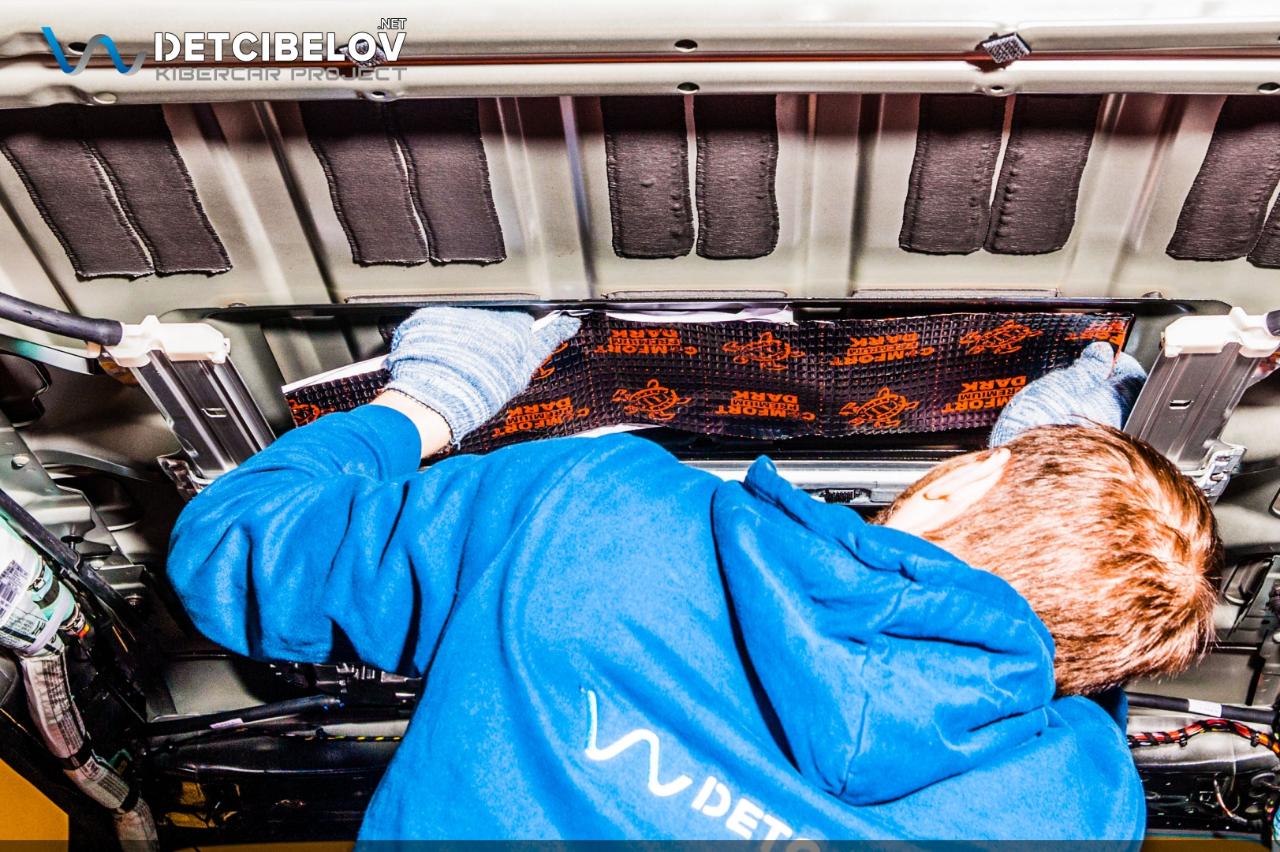 Следующий этап – шумоизоляция крыши. Максимально аккуратно чистыми одноразовыми перчатками демонтируем потолочную обшивку и обезжириваем поверхность потолка. После предварительной подготовки приступаем к шумоизоляции. Comfort mat Dark D3 Premium (3 мм) – облегченный виброизолятор. Comfort mat Wave Expert (15 мм) – шумопоглощающий материал, который обеспечивает не только шумо, но и теплоизоляцию.
