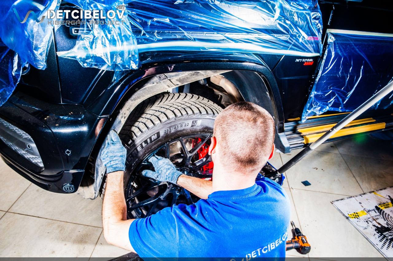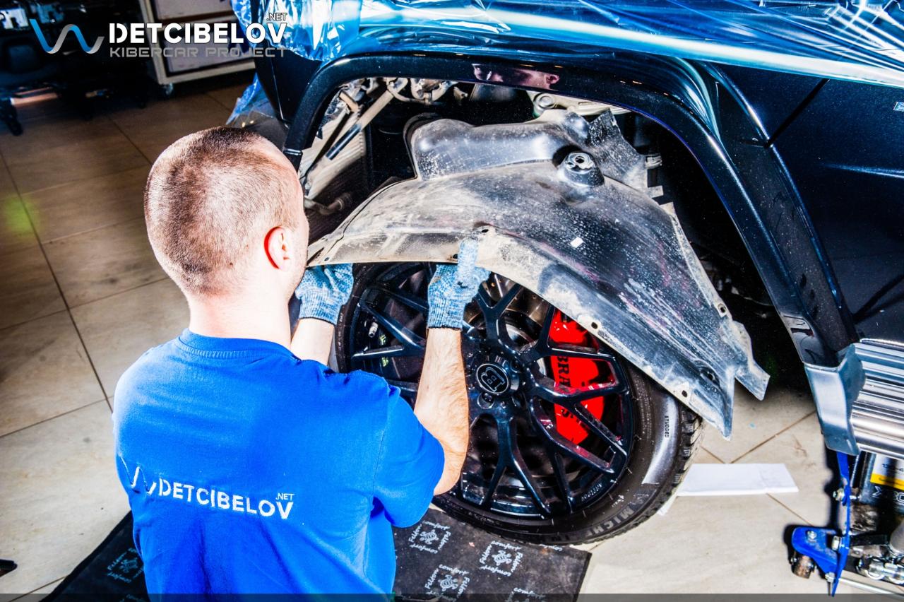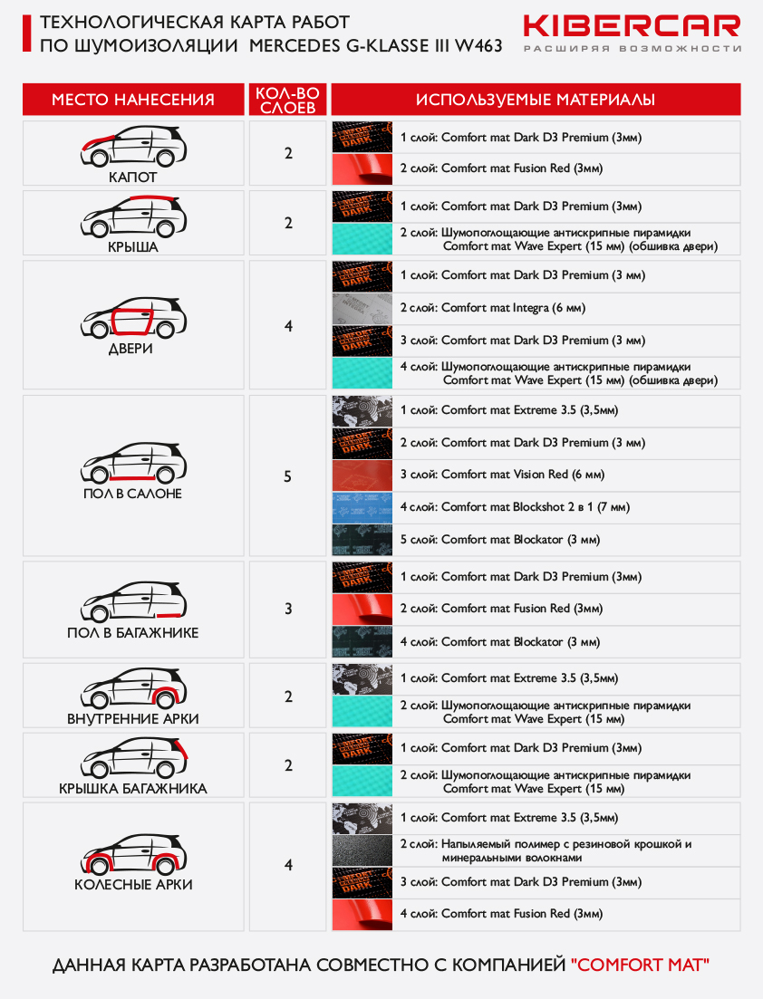 Финальным этапом шумоизоляции Mercedes-Benz G-class Brabus будет шумоизоляция колесных арок. Это позволит нам существенно усилить эффект снижения шума, издаваемого резиной автомобиля. Сначала снимаем 4 подкрылка, обезжириваем их поверхность и наносим следующие слои. Начинаем работы по шумоизоляции арок с внешней стороны. Comfort mat Extreme 3.5 – заранее нагретый в печи многослойный вибродемпфер, каждый слой которого несет особую функциональную нагрузку. Затем наносим слой напыляемого полимера с резиновой крошкой и минеральными волокнами. Заливаем все швы и получаем после высыхания эластично-упругое покрытие черного цвета. Comfort mat Dark D3 Premium (3 мм) – облегченный вибродемпфер. Comfort mat Fusion Red (3 мм) – шумопоглощающий материал.
