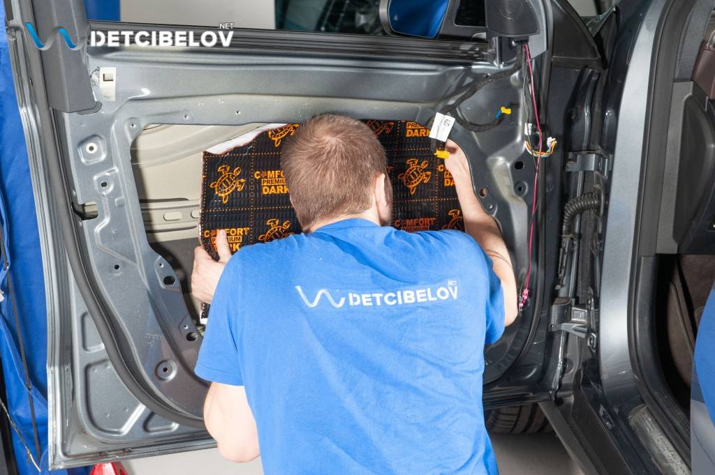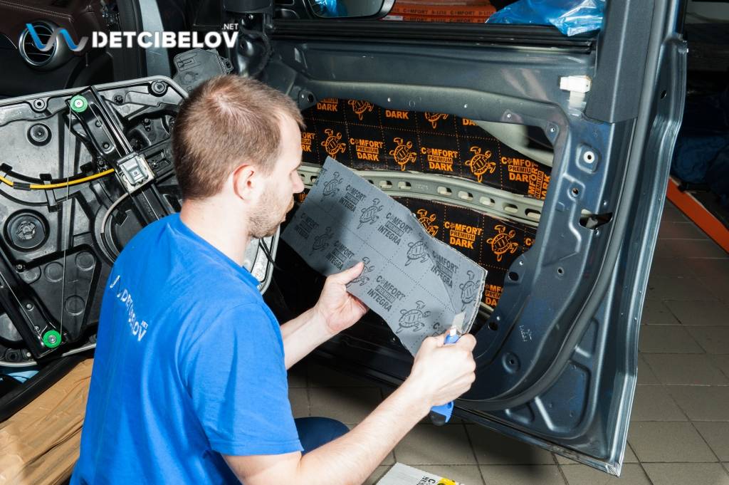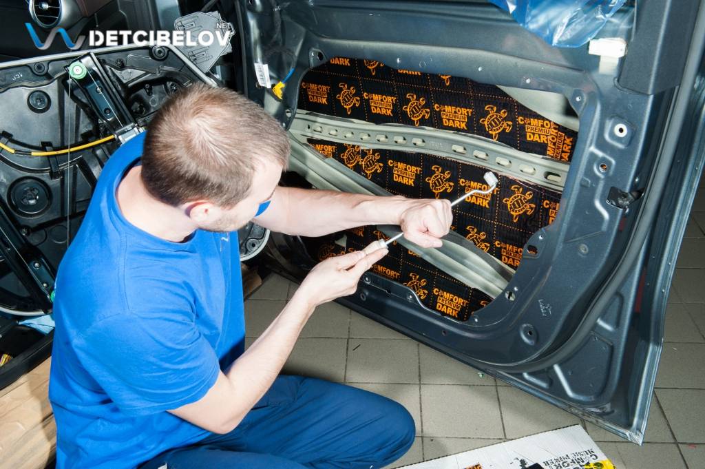 Работы по шумоизоляции начинаем с дверей. Максимально аккуратно разбираем дверные обшивки. После того, как дверь разобрана, подготавливаем поверхность и обезжириваем все участки, на которые будут наноситься виброизоляционные материалы. Первым слоем у нас идет облегченный виброизолятор Comfortmat Dark D3 Premium. Вторым слоем наносим самую легкую из всех существующих мембранных звукоизоляций Comfortmat Integra (6мм), материал сочетает в себе звуко- и теплоизолирующие свойства за счет применения уникальной акустической мембраны и многослойной структуры. Третьим слоем, штатный дверной пластик и четвертым, заключительным слоем используем шумопоглащающий материал последнего поколения, пенополиуретановую пенорезину Comfort mat Wave Expert 15мм с увеличенным коэффициентом шумопоглощения, который окончательно задерживает посторонние шумы, этот же материал, выступает в роли анти-скрипа.