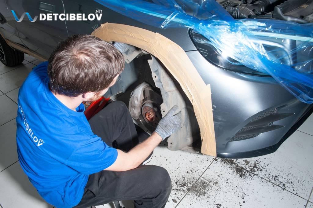 Финальным этапом шумоизоляции Mercedes GLC будет, шумоизоляция колесных арок. В данном случае мы обработали подкрылки этого автомобиля в два слоя и внутреннюю поверхность колесных арок. Первый слой виброизолирующий материал Comfort mat Dark D3.