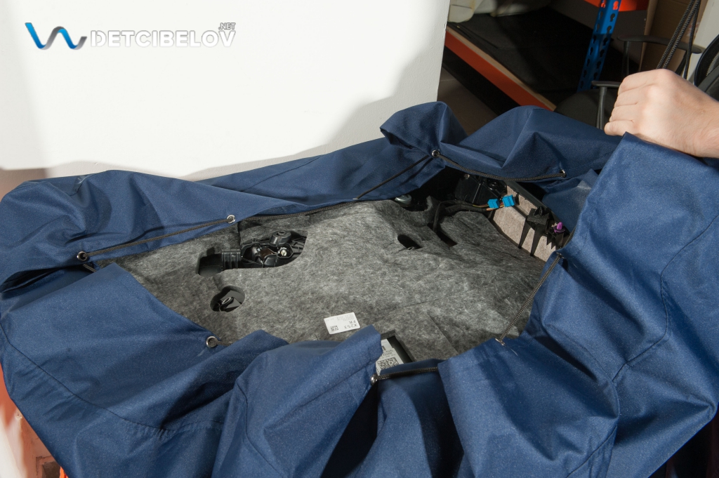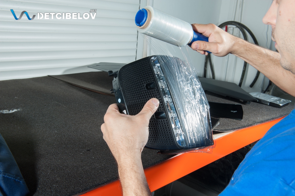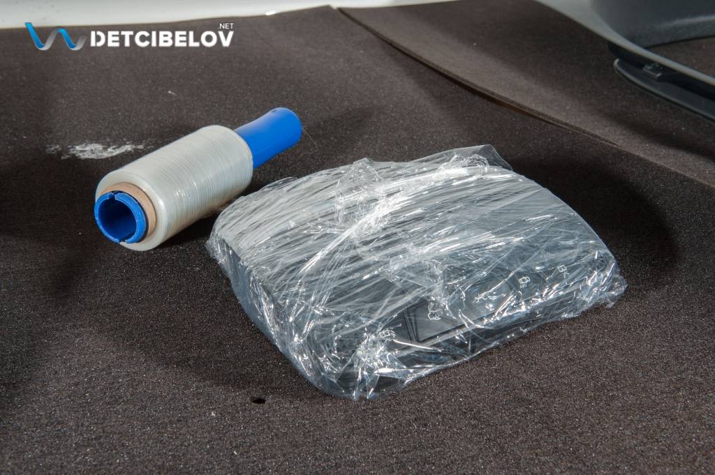 Приступаем к работе. Первым делом максимально защищаем автомобиль: оклеиваем пленкой все внешние элементы автомобиля, затем наносим скотч на пороги и арки дверей, упаковываем все мелкие пластиковые элементы в стретч-пленку. Сиденья и карты дверей помещаем в специальные чехлы.