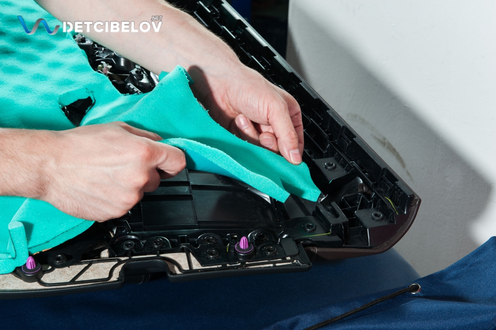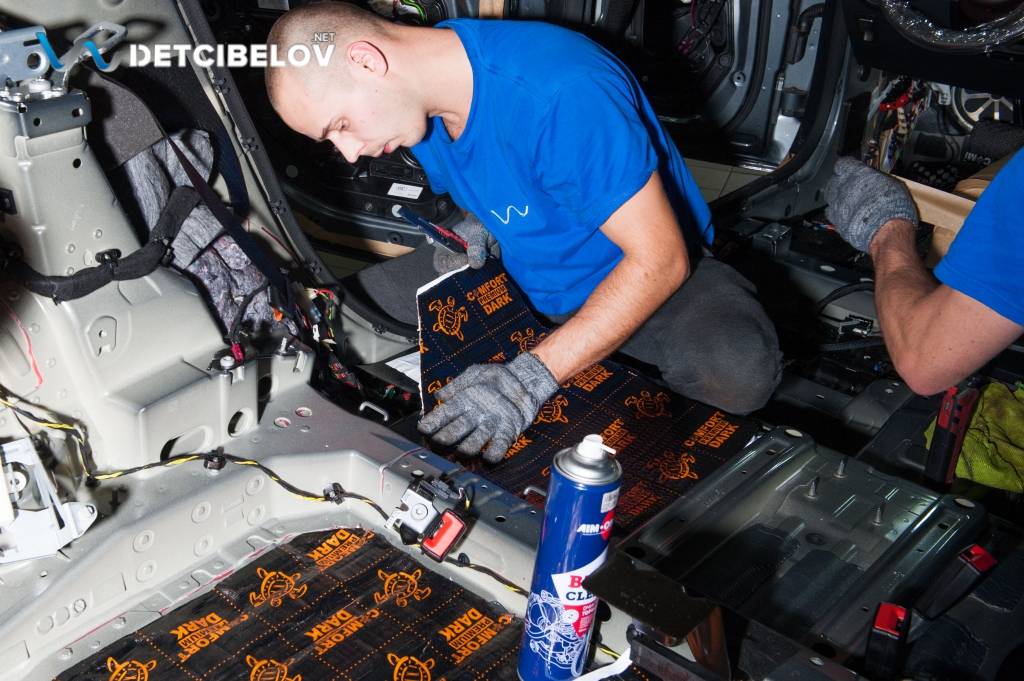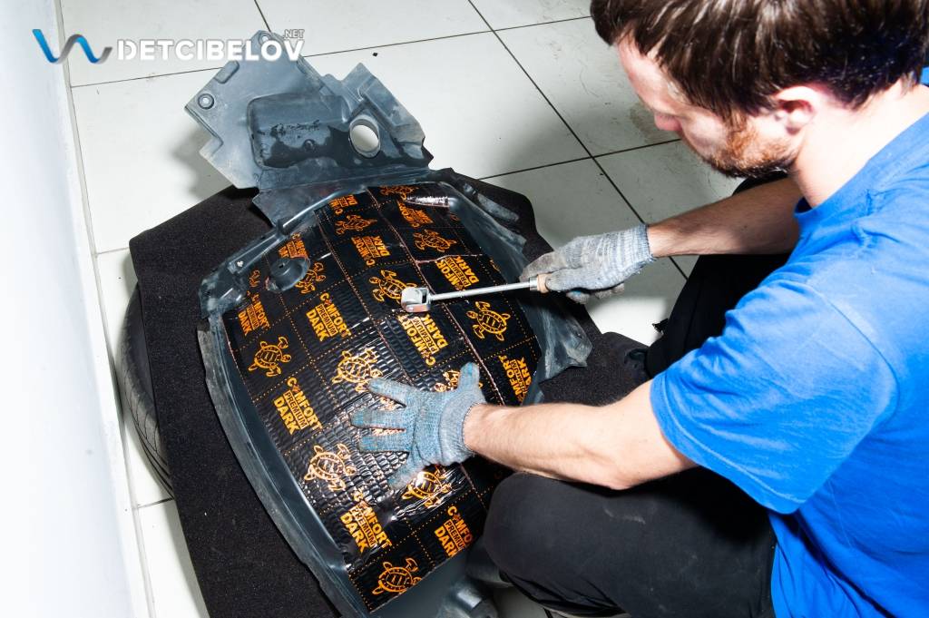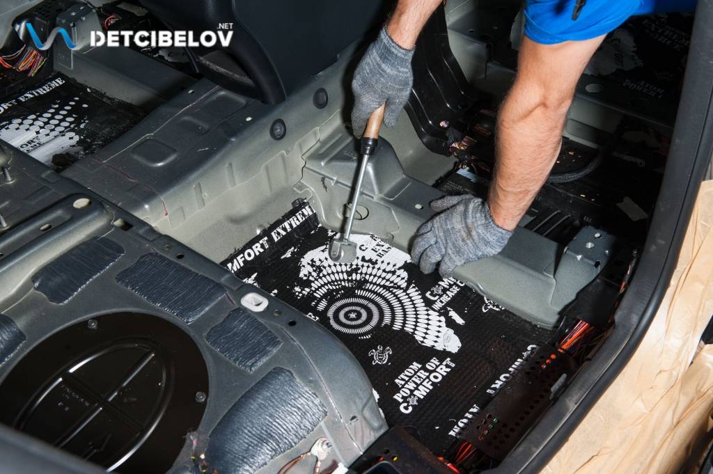 это обязательное условие, иначе качественно прикатать этот материал не удастся. Его мы используем на полу и на задних колесных арках. Далее приступаем к самой ответственной части шумоизоляии автомобиля - пола, багажника и внутренних колесных арок. Данный этап начинается с полного демонтажа сидений, ковров, обшивок и т.д., ничего не должно мешать проводимым работам.