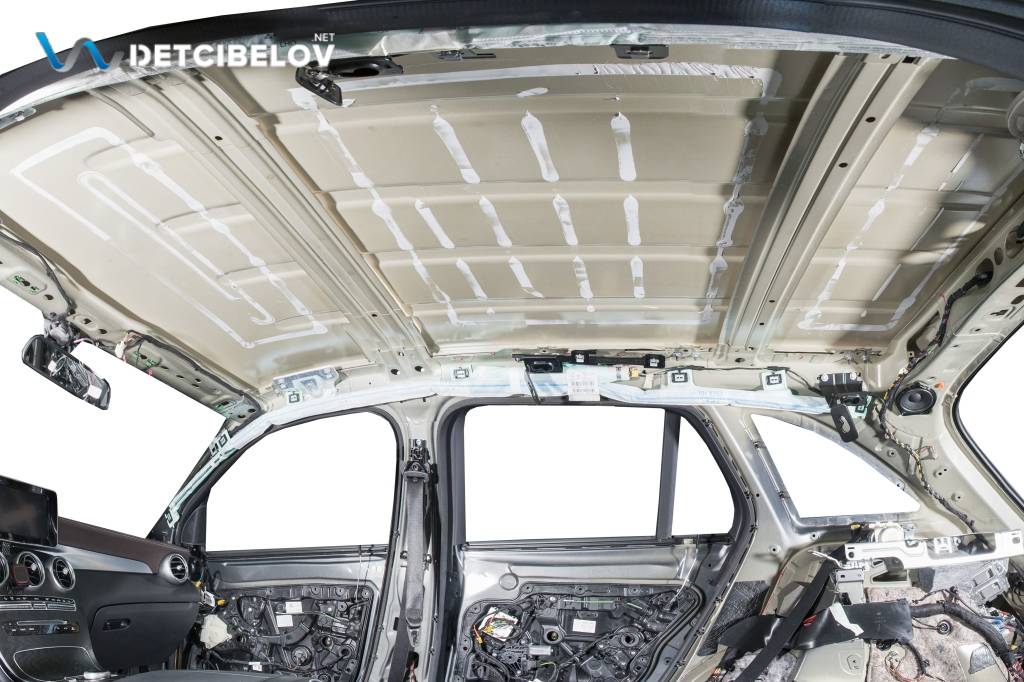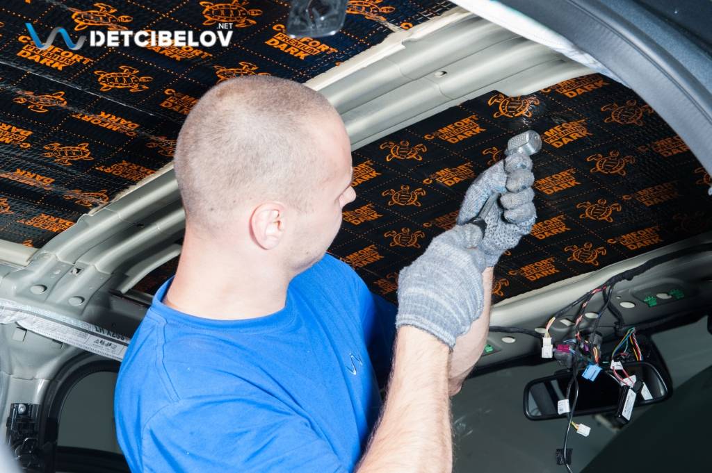 Затем приступаем к шумоизоляции потолка. Максимально аккуратно, чистыми одноразовыми перчатками демонтируем потолочную обшивку. После обезжиривания поверхности потолка начинаем монтаж виброизолятора Comfort mat Dark D3 Premium. Затем шумопоглотитель Comfortmat SkyLine — это легкая мембранная звукоизоляция, рабочая часть этого шумоизоляционного материала состоит из шумоизоляционной прослойки, накрытой плотной тонкой звукоизоляционной мембраной.