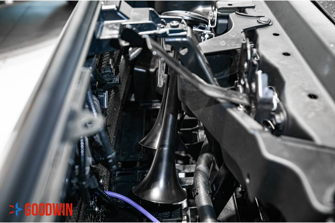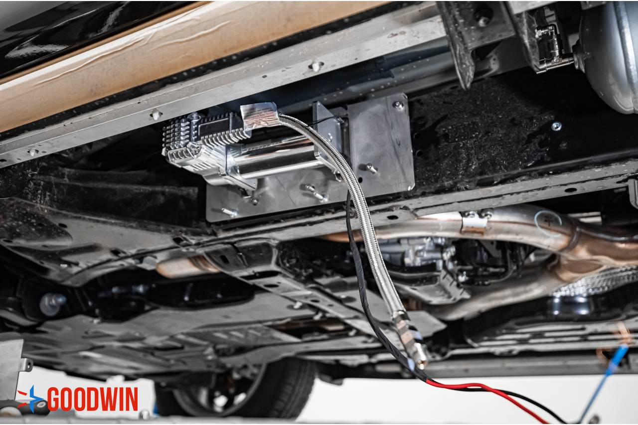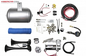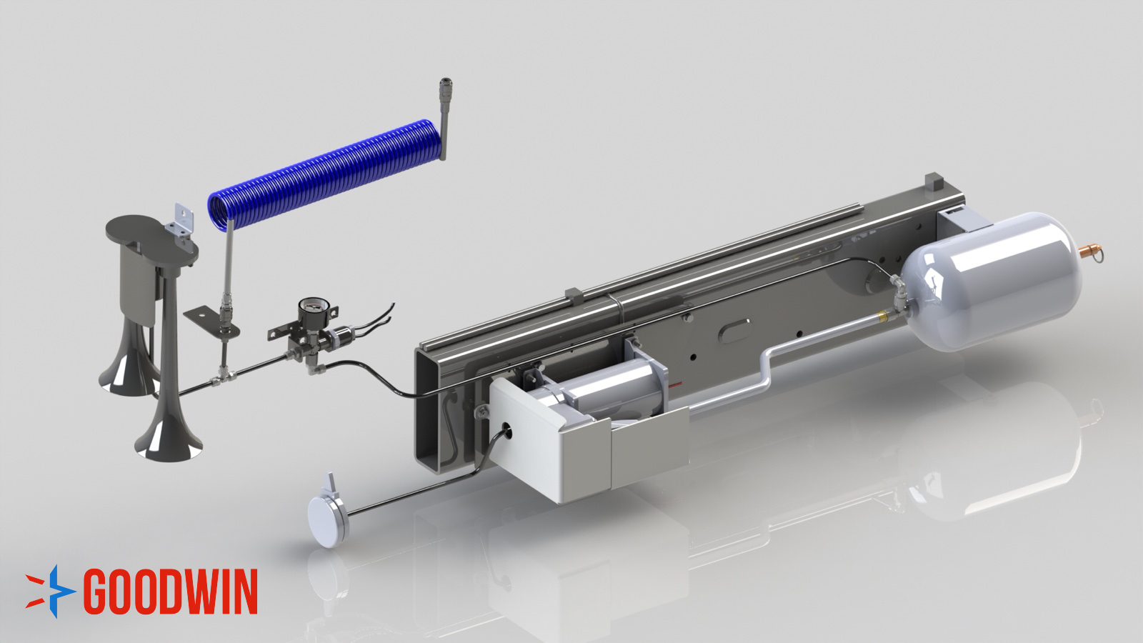 Специально разработанная компрессорная система GOODWIN которая позволяет реализовать такие опции в автомобиле, как «пневматический сигнал» и «стационарная подкачка колес». Мощная 152 dB и компактная система способна
