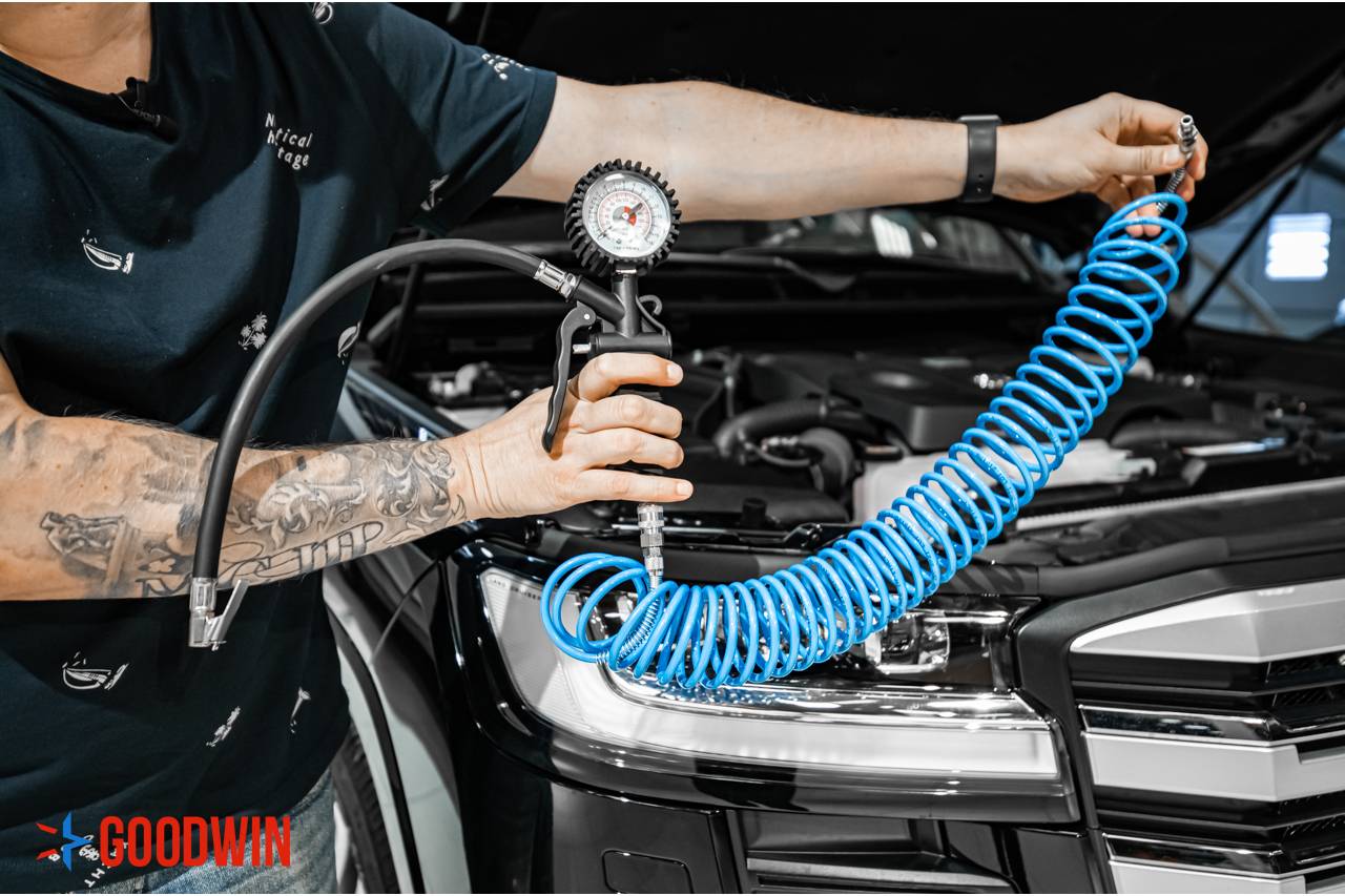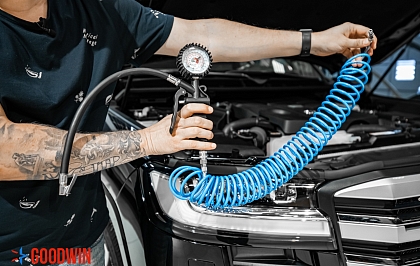 Производительность системы GOODWIN при штатных режимах эксплуатации – 38 л/минуту, что позволяет быстро накачать даже спущенные «в ноль» колеса, не используя домкрат. Создаваемого компрессором давления 10,4 атм хватает даже для тяжелого внедорожника, позволяя не приподнимать машину домкратом.