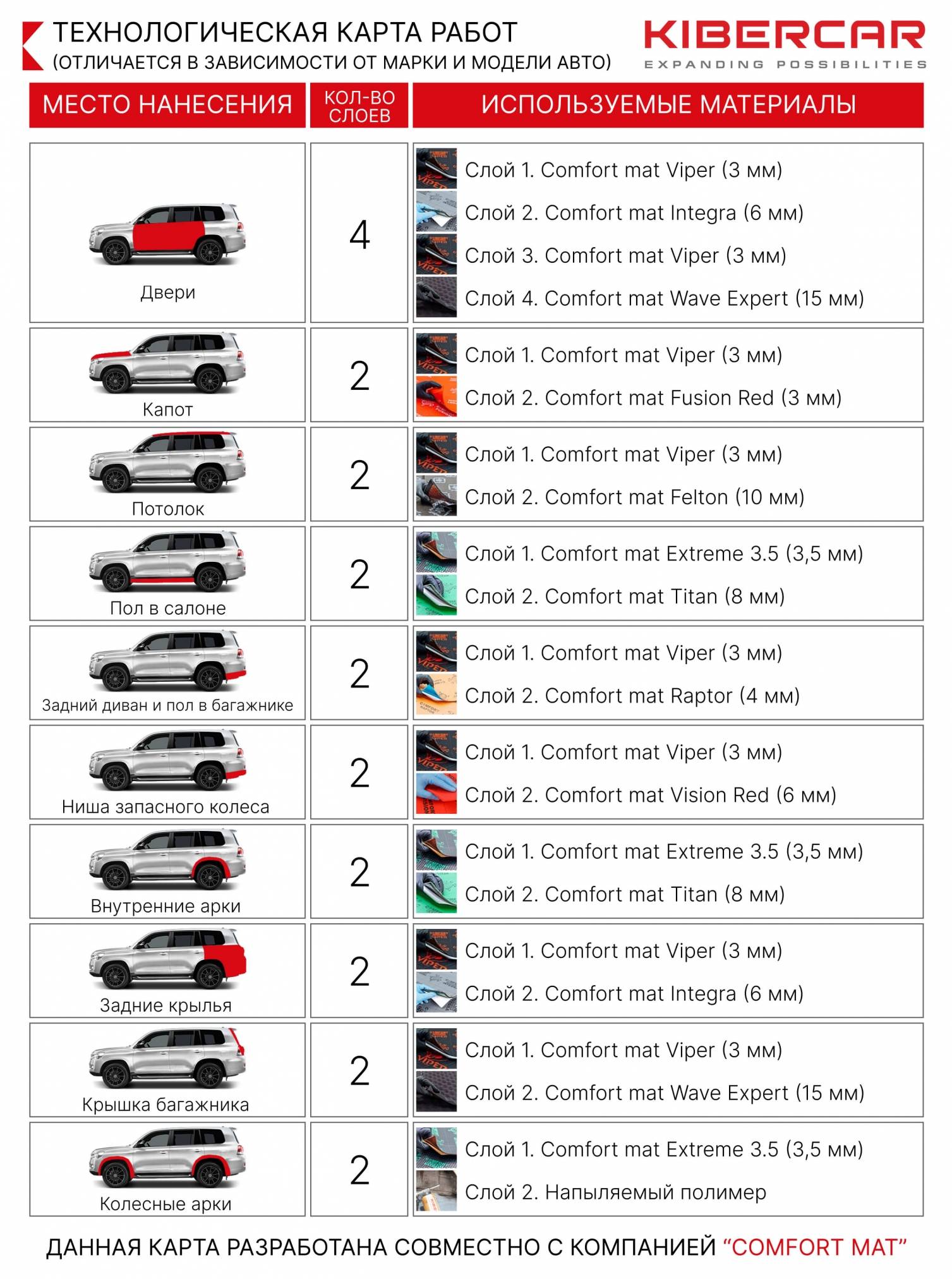 Применение разных материалов Comfort mat в комбинации позволяет добиться наилучшего результата, создавая индивидуальную систему шумо- и теплоизоляции, которая учитывает все особенности конкретного автомобиля.